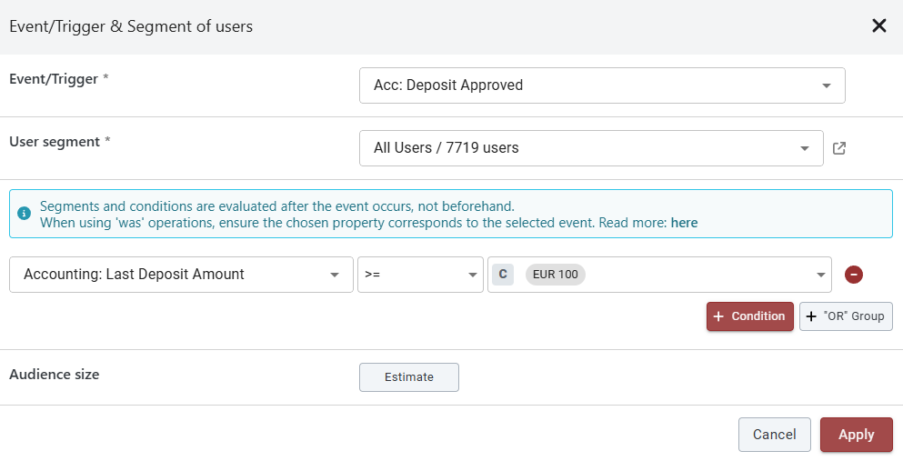 **Here's an example scenario:** *You can set up a journey to award bonuses to players who have made deposits of 100 EUR or more, with only the first 30 players who enter the campaign receiving the bonus.*