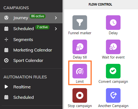 The ‘Limit’ activity is available in the flow builder for both Journeyes and Scheduled Campaigns.