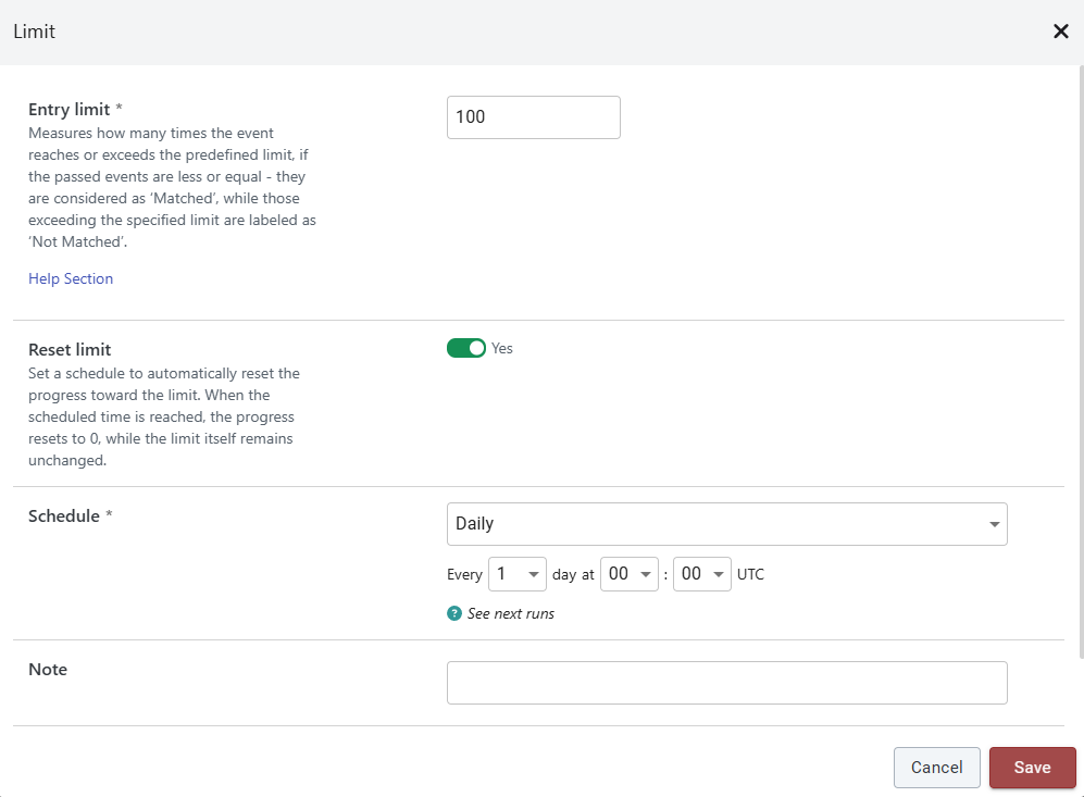 **For Journeys** - by default, the option is disabled, meaning that the progress made in the Limit activity will not be reset. When enabled, the progress made in the Limit activity will be reset based on the defined schedule, while the limit itself remains unchanged.