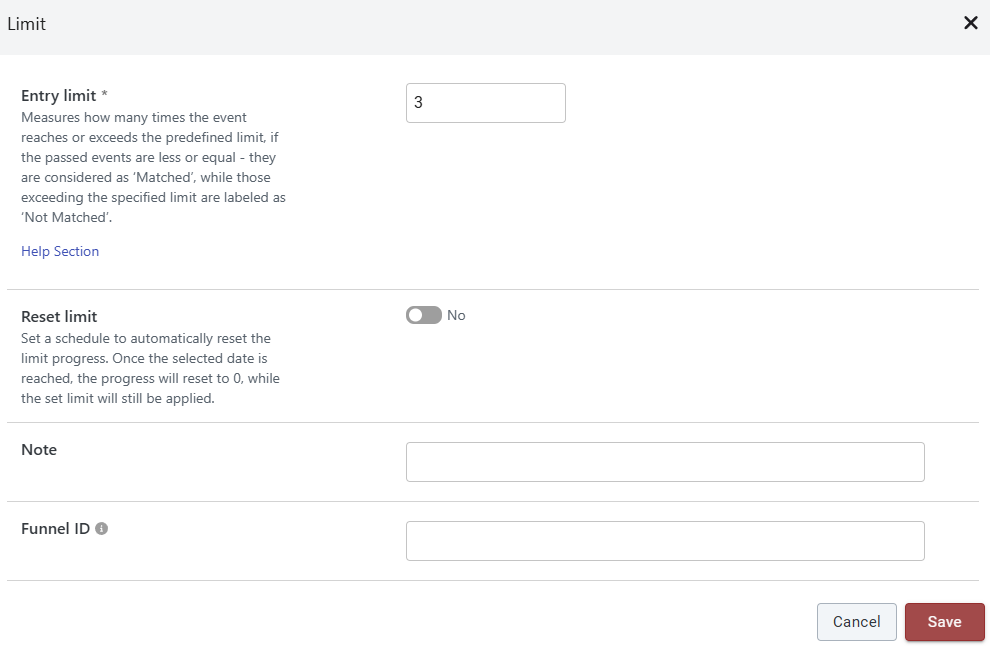 The Limit activity measures how many times the event reaches or exceeds the predefined limit. If the passed events are less than or equal to, they are considered as ‘Matched’, while those exceeding the specified limit are labeled as ‘Not Matched’. This way, you can define what the outcome will be in both cases - when the limit is reached and after it is exceeded.