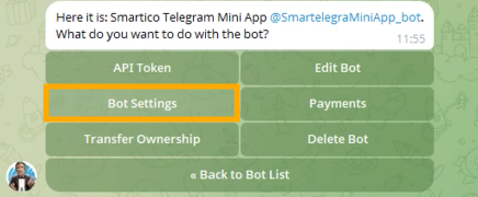 4. You'll be redirected to Bot Father (the Telegram bot used to create your bot). An **automatic reply** will provide different configuration options.