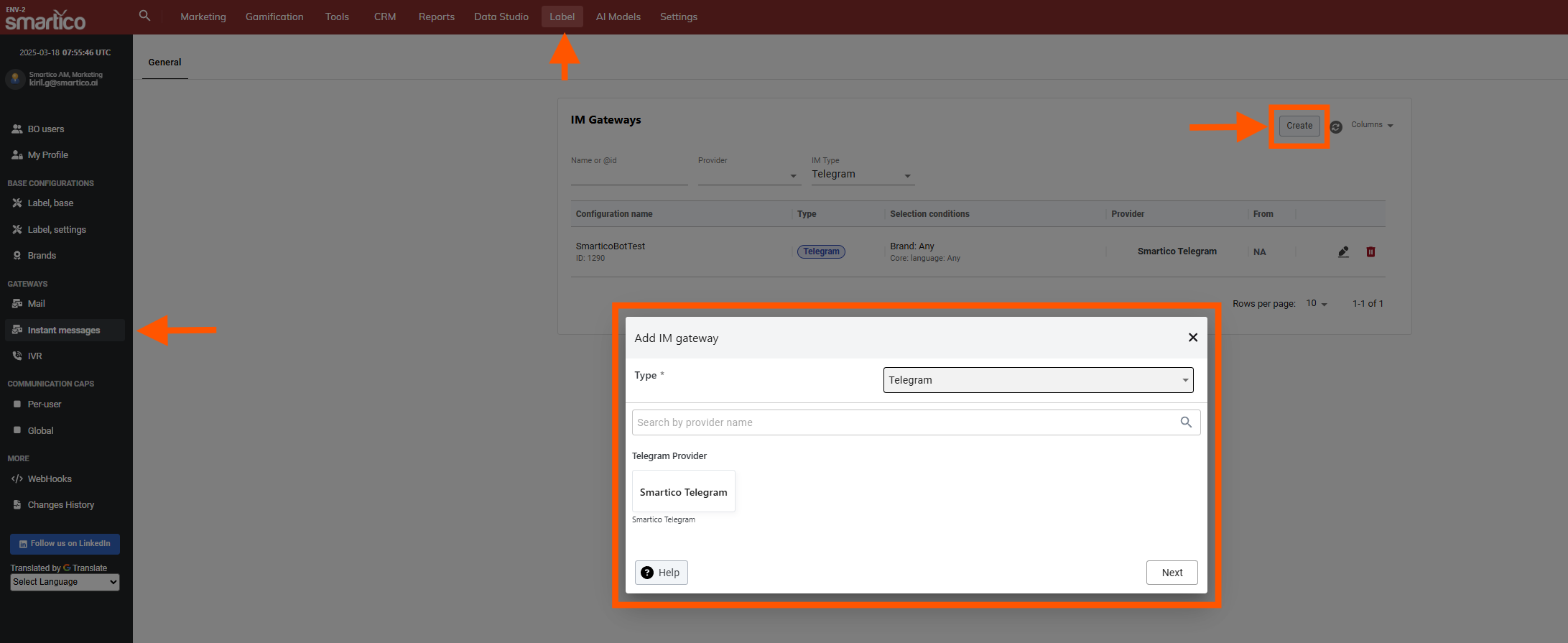 1. Log in to Smartico Back Office and navigate to Label → Instant Messages.