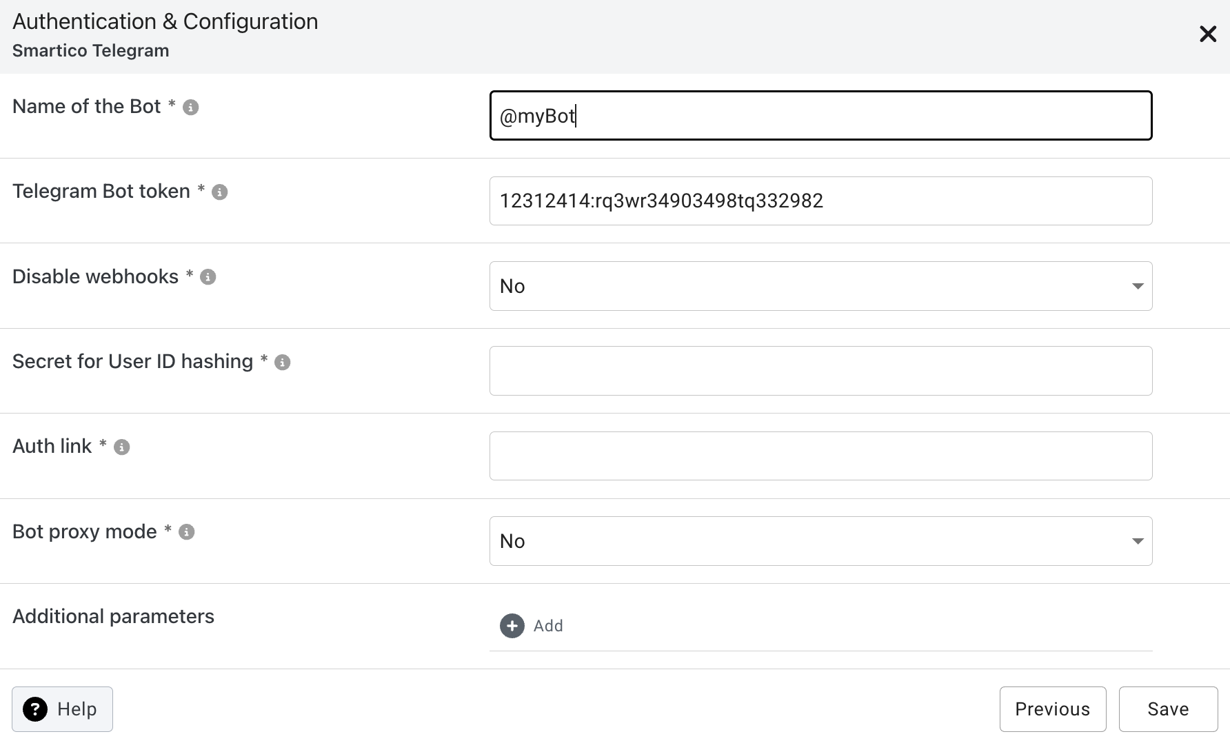 * **Disable WebHooks:** When set to "yes", the Smartico system will not stitch the player with the Smartico CRM and will not register a webhook on the Telegram side. This option can be used if you already have a bot, have logic to connect a Telegram user to the PAM player, and want to use Smartico only to send Telegram messages while keeping full control of the bot on your technical side. Important that you should provide the value of `core_telegram_chat_id` for each player with whom you want to communicate over the REST API using the `update_profile` event, or to expose in the DB or via Kafka/RabbitMQ