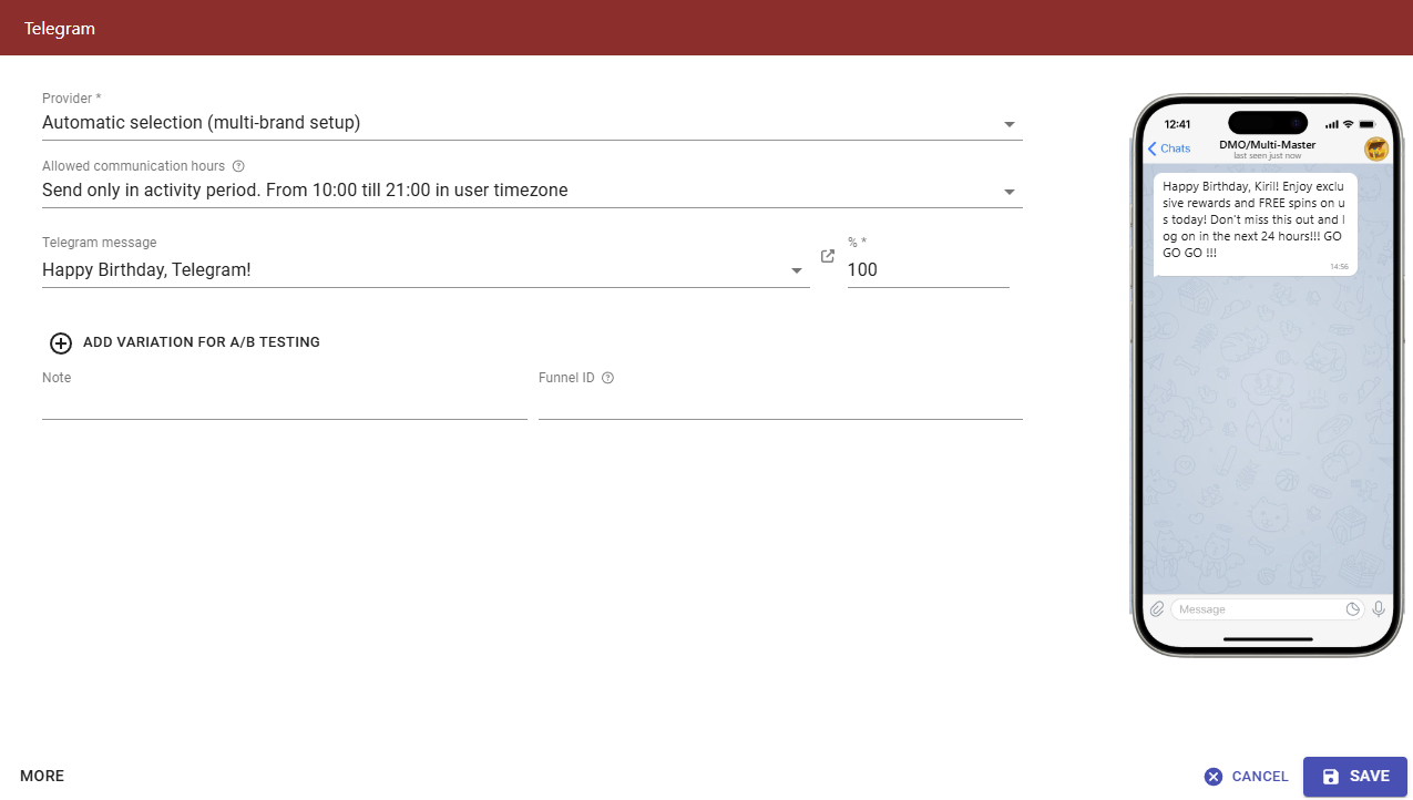 3. **Telegram message** - used to add the asset that will be sent to players, where you can define the message content. Before sending any communication via Telegram, the corresponding asset must be created. You can also add multiple message variations for A/B testing, allowing you to test different versions and optimize engagement. When adding a second variation, you can specify the percentage of the audience that will receive each version, ensuring controlled message distribution.