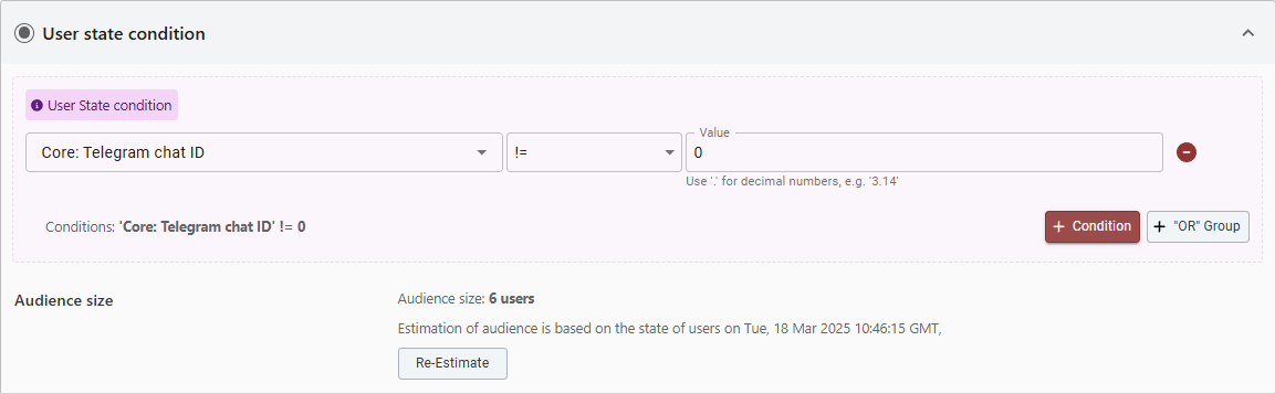 * You are targeting users who are subscribed to the Telegram bot. Your segment conditions should check for "Telegram chat id" <> 0