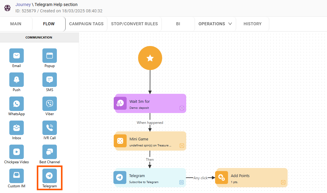 <div data-with-frame="true"><figure><img src="https://77049817-files.gitbook.io/~/files/v0/b/gitbook-x-prod.appspot.com/o/spaces%2FfS5hl0PiysHtKAKMsQTe%2Fuploads%2Fgit-blob-2229c2bbdd64bc5402a38f5c8b976a822050345a%2FJourney%20%5C%20525830%20-%20smartico.ai%20%40%20EU7%202025-03-18%2014-15-22.png?alt=media" alt=""><figcaption><p>Example of campaign that is started when user is joining telegram bot</p></figcaption></figure></div>