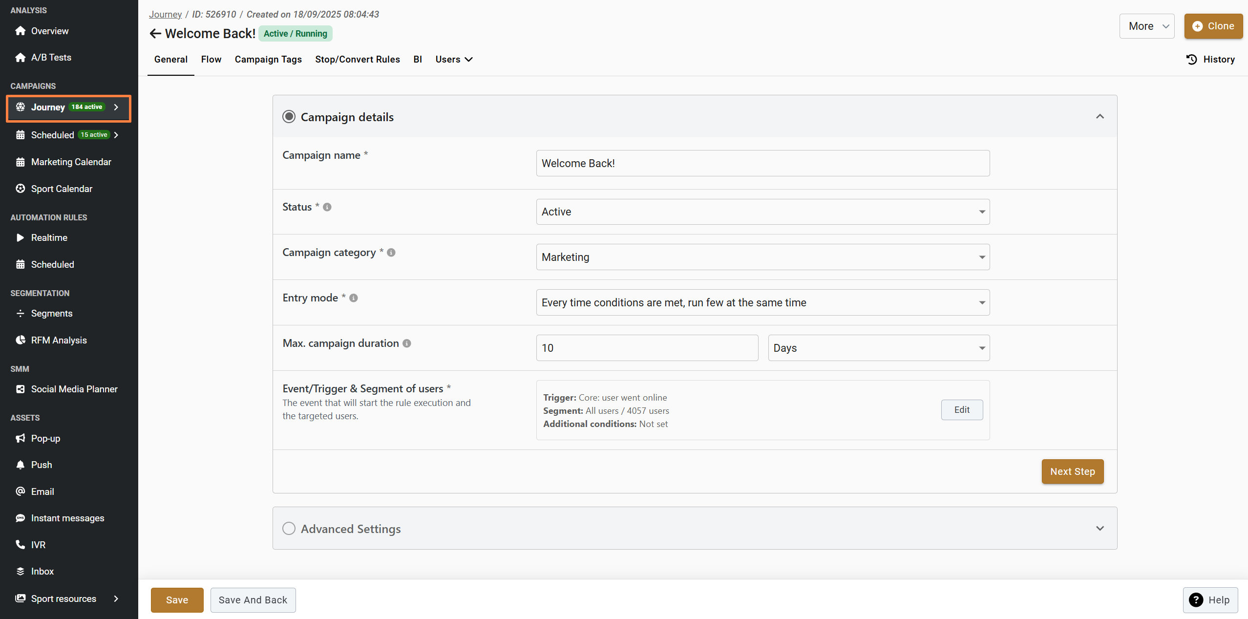 * **Entry trigger** - can be any event defined in the system (Deposit approved, User Login, User Logout, Sport bet, Casino bet, etc.)