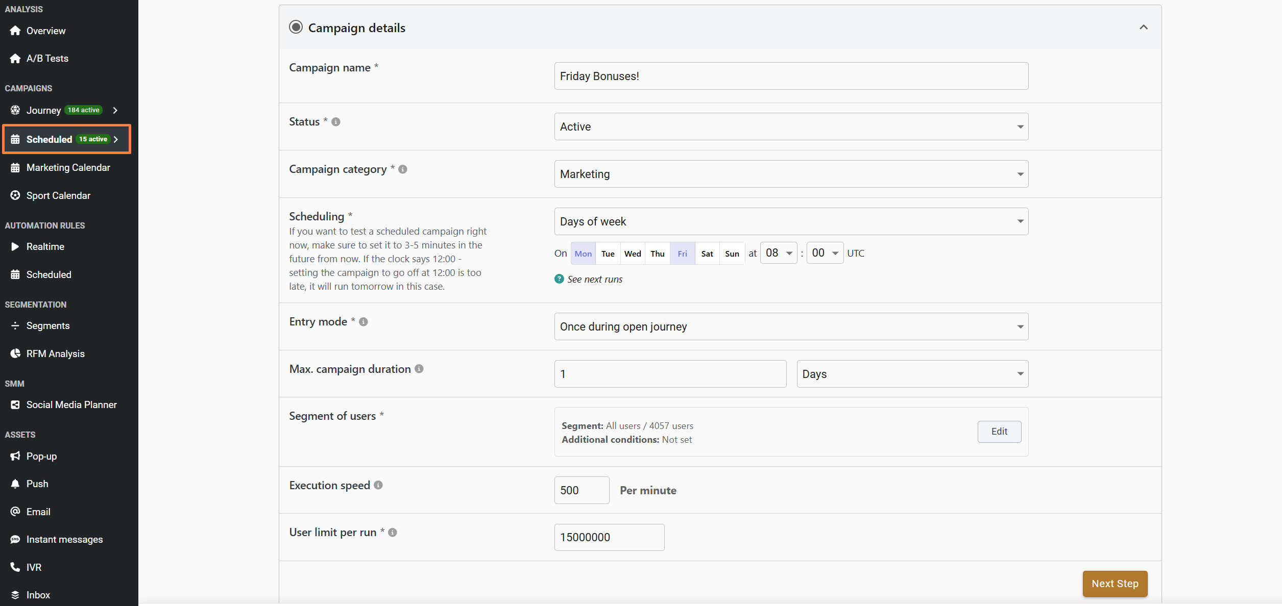 Scheduled campaigns offer nearly the same configuration options as real-time campaigns, with one key difference: they are triggered by a schedule rather than an event. Below are the settings specific to scheduled campaigns: