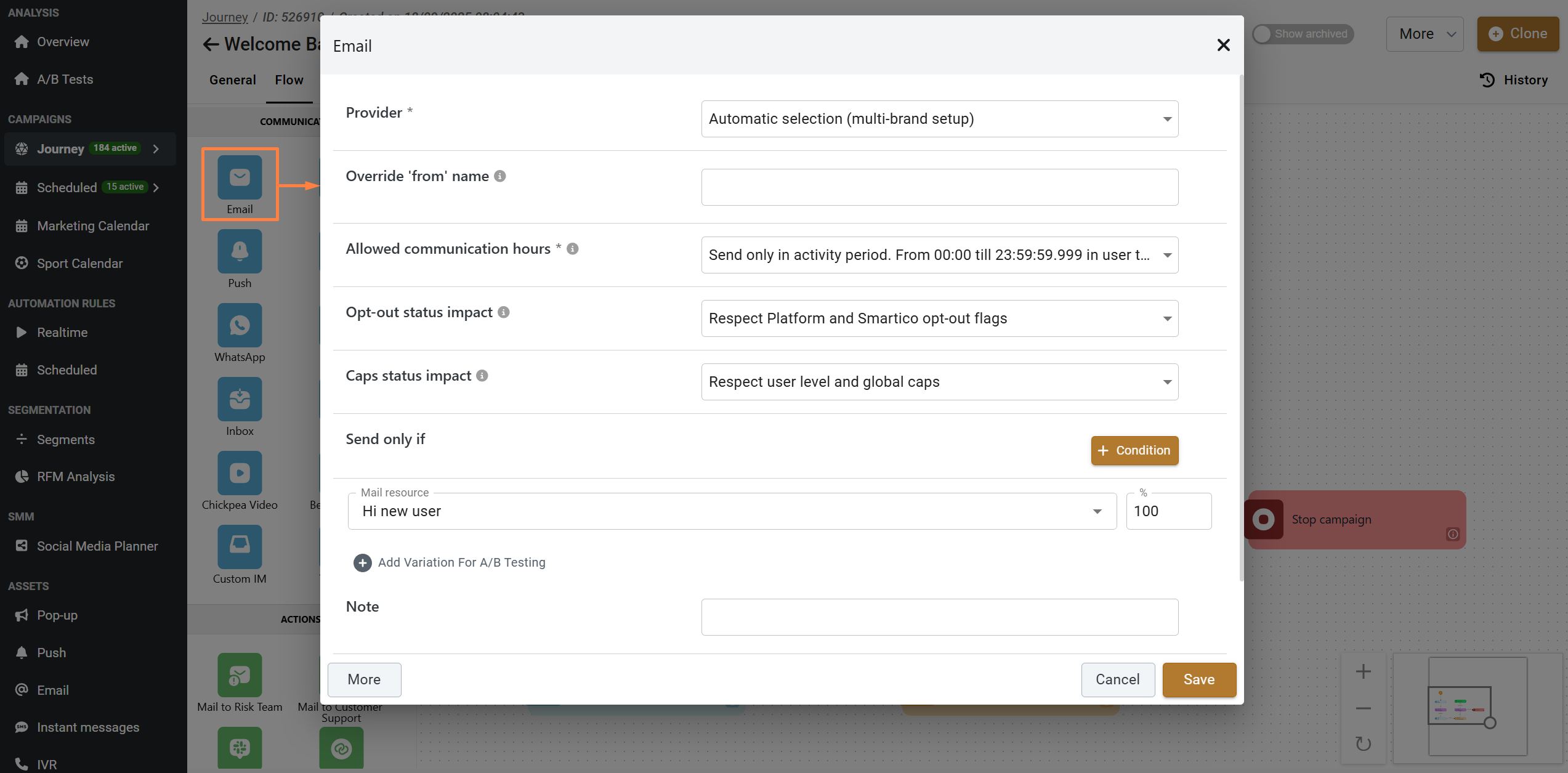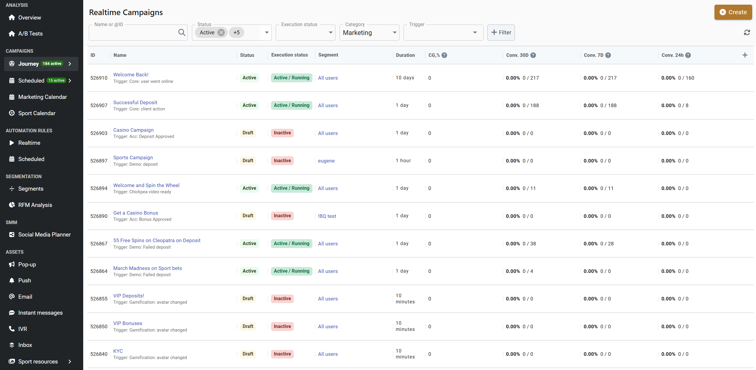 Triggered immediately by specific player events, such as Deposit, Withdrawal, Login, Casino or Sports bets, Account status changes, client actions, etc. When setting up a real-time campaign, you can configure: