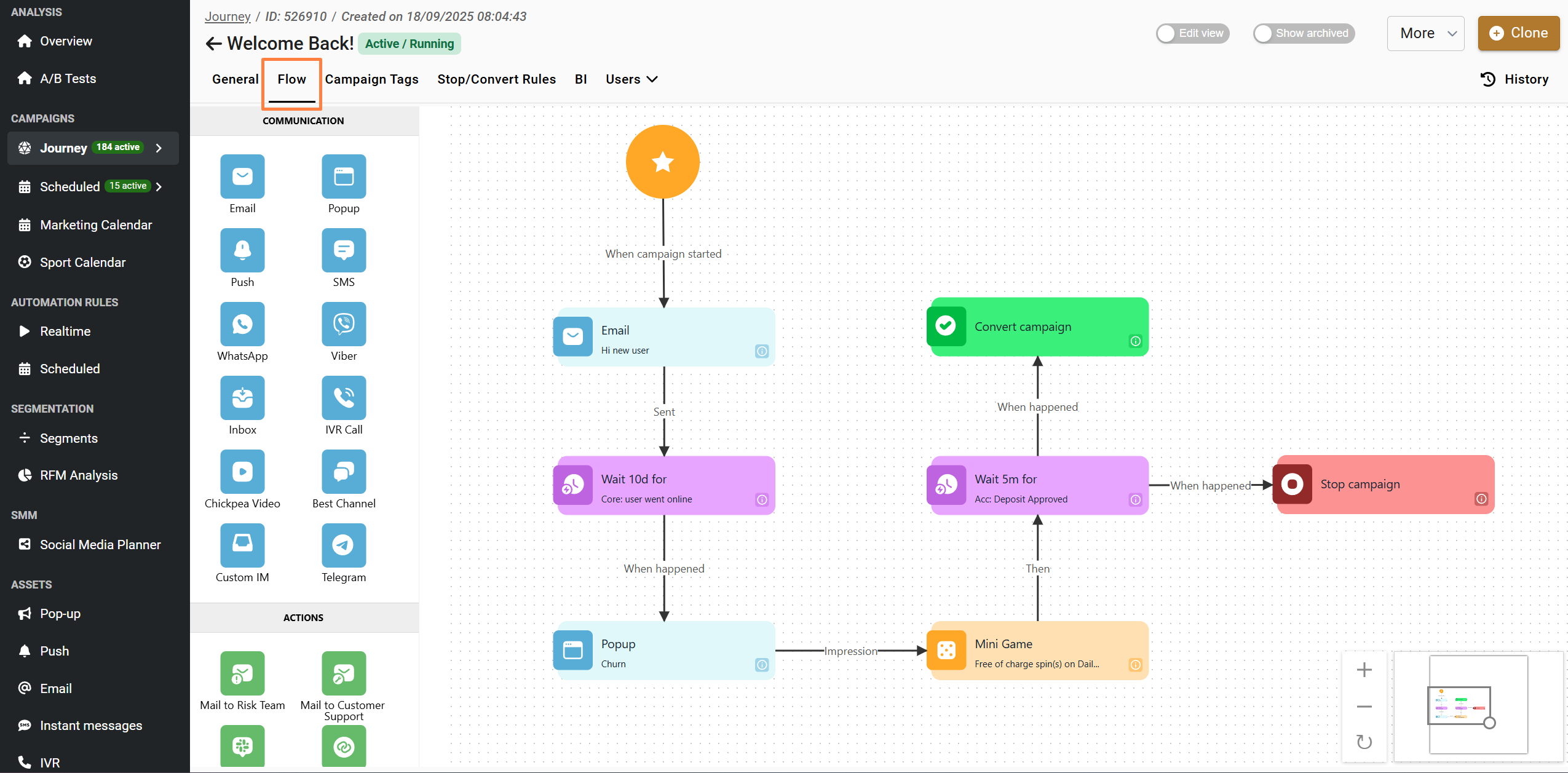 Both campaign types are created with the Smartico Flow Builder, a visual tool for planning and automating campaigns that guide users throughout their engagement journey with your brand.