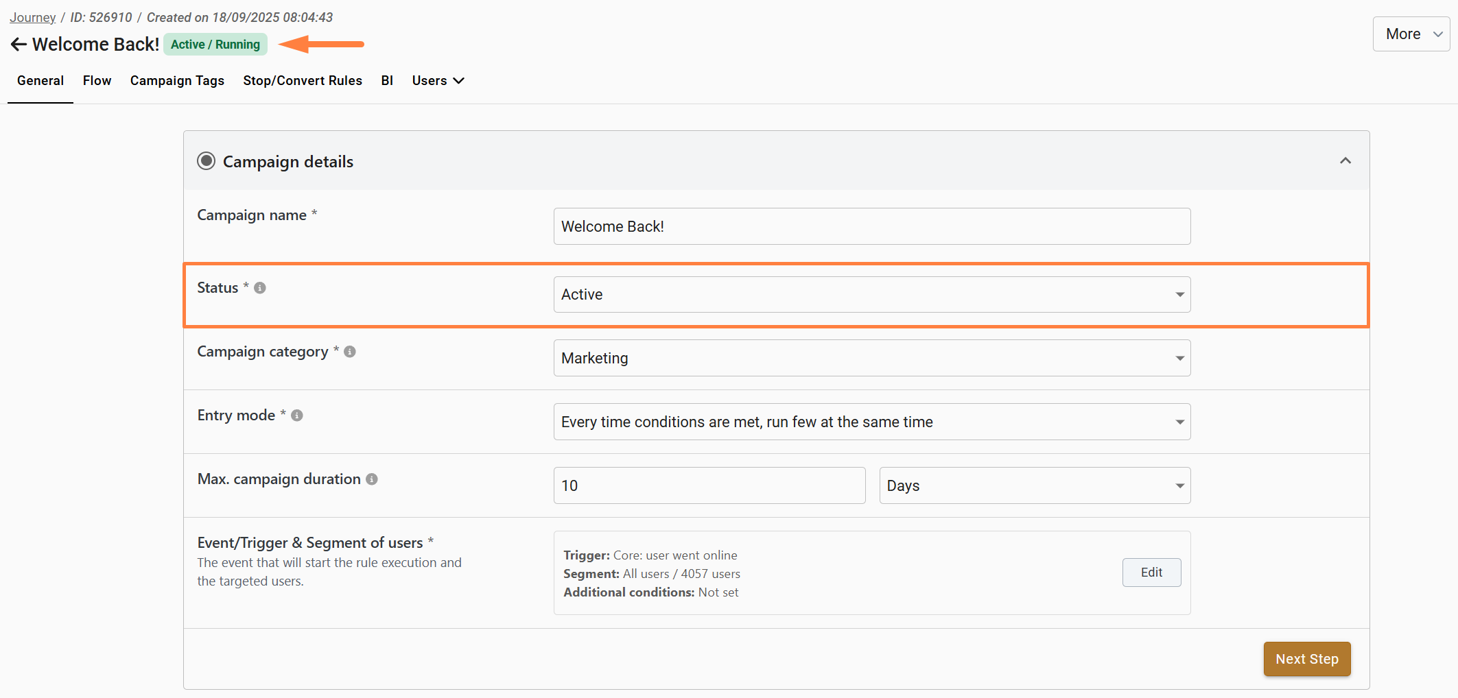 3. **Paused:** Campaign is temporarily stopped but can be reactivated. Campaigns are still running for users who entered Journey, but new users will not enter.