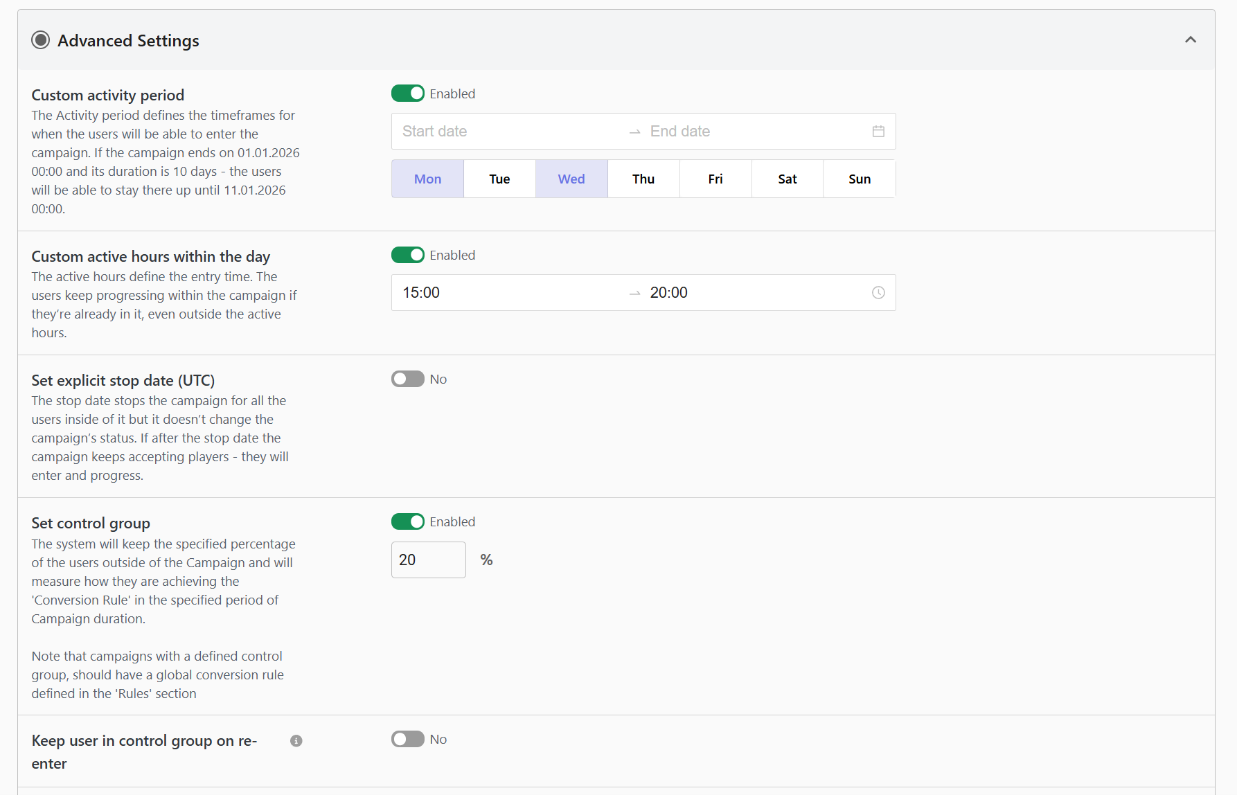 <figure><img src="https://77049817-files.gitbook.io/~/files/v0/b/gitbook-x-prod.appspot.com/o/spaces%2FfS5hl0PiysHtKAKMsQTe%2Fuploads%2Fgit-blob-80828645dd1232e7c1a160f88e16931a7e314222%2FScreenshot_39.png?alt=media" alt=""><figcaption><p>BO: Advanced settings in Campaigns</p></figcaption></figure>