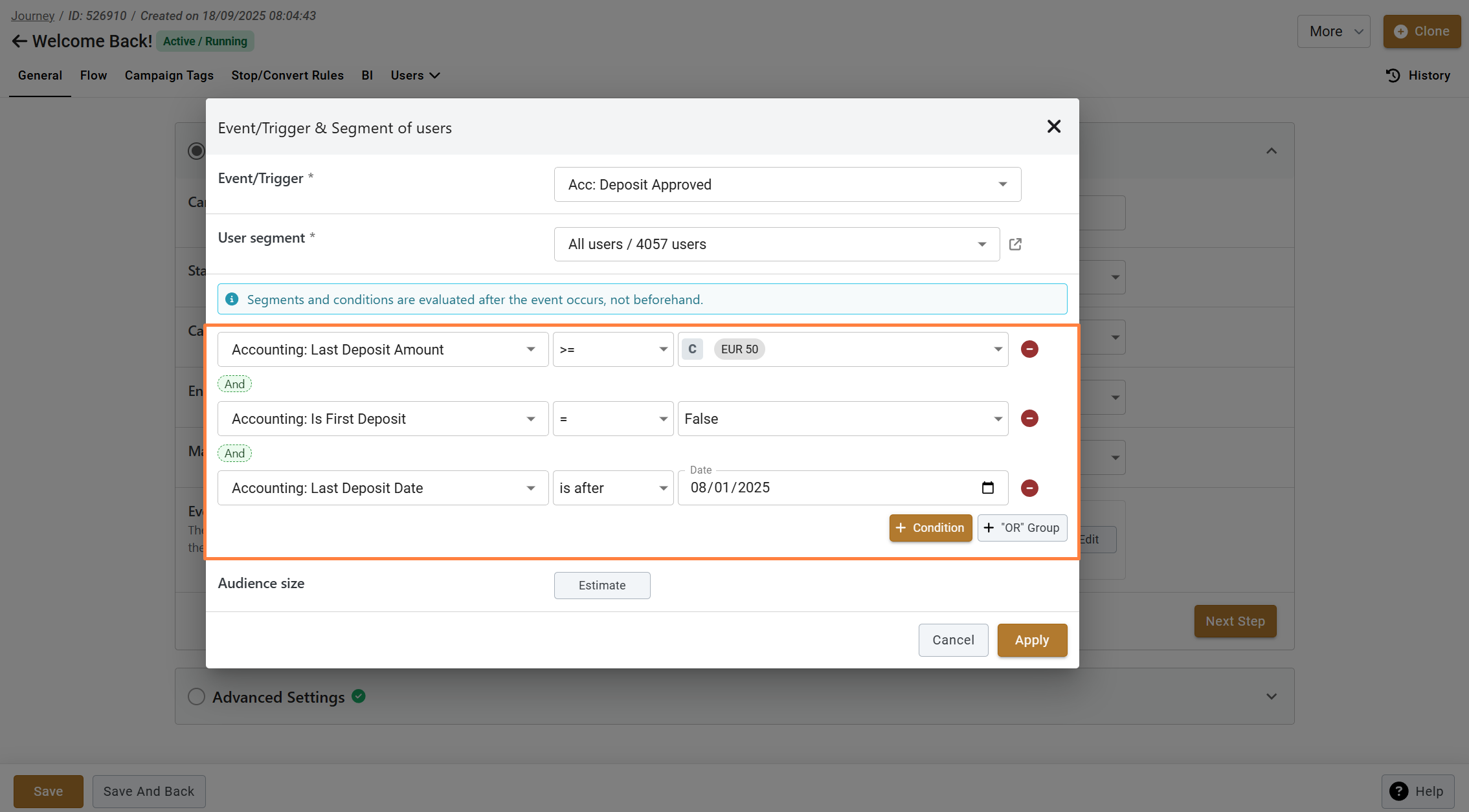 An important element for the proper evaluation of the campaign performance. Smartico will keep the specified % of the users outside of the Journey and will measure how they are achieving ‘Conversion Rule’ in the specified period of the Campaign duration i.e Conversion rule is “deposit approved”, will count how many users within the journey deposited during the period of the campaign compared to the ones who entered the CG without going through the engagements of the campaign
