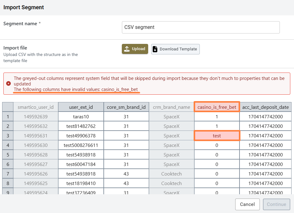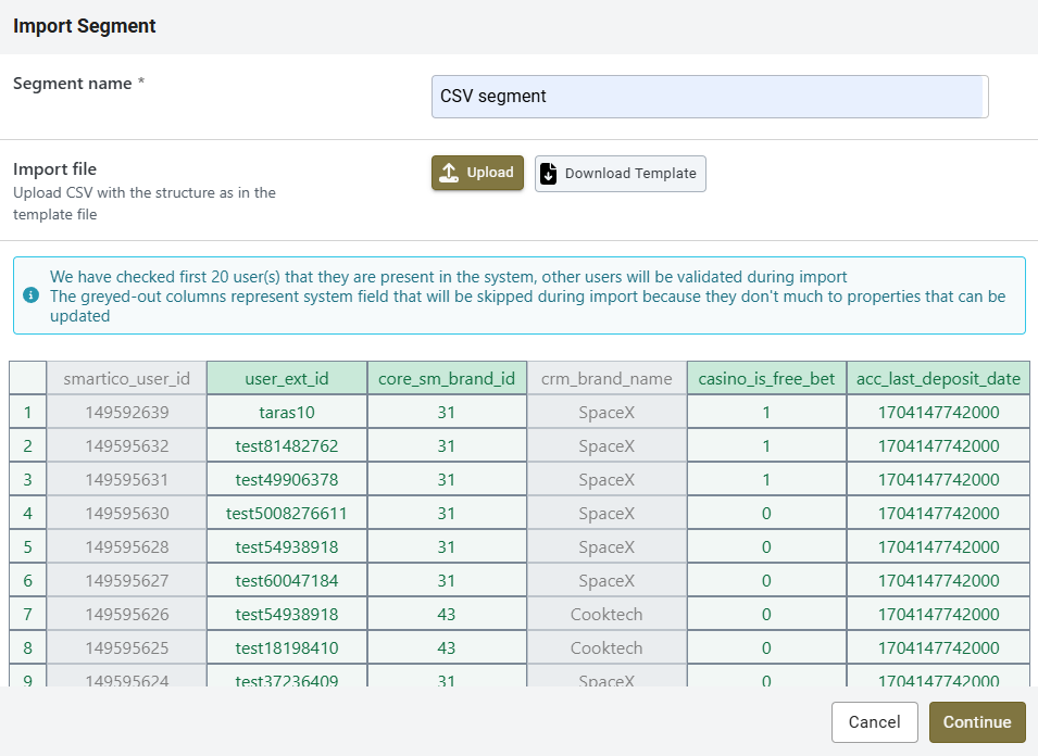 Note that ***core\_sm\_brand\_id*** column is required in case you have multiple brand and non-unique user\_ext\_id across them. For example you have user with id 55 in brand A and user with same ID in brand B. In order for Smartico to understand which exactly user should be imported, you need to specify the ID of brand