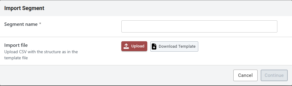 Once clicked It will open a window where you'll have to add a name for the segment and upload the already prepared CSV file. Please note that there is a special formatting required for the data in order for the import to be successful. You can also download a template of the CSV file.