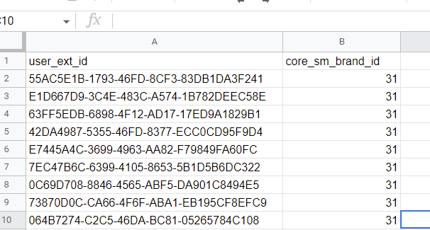 Depending on a Label setting in the CSV file, you must have one or two mandatory columns - the *user\_ext\_id* and *core\_sm\_brand\_id.* In most cases the only mandatory column is user\_ext\_id.