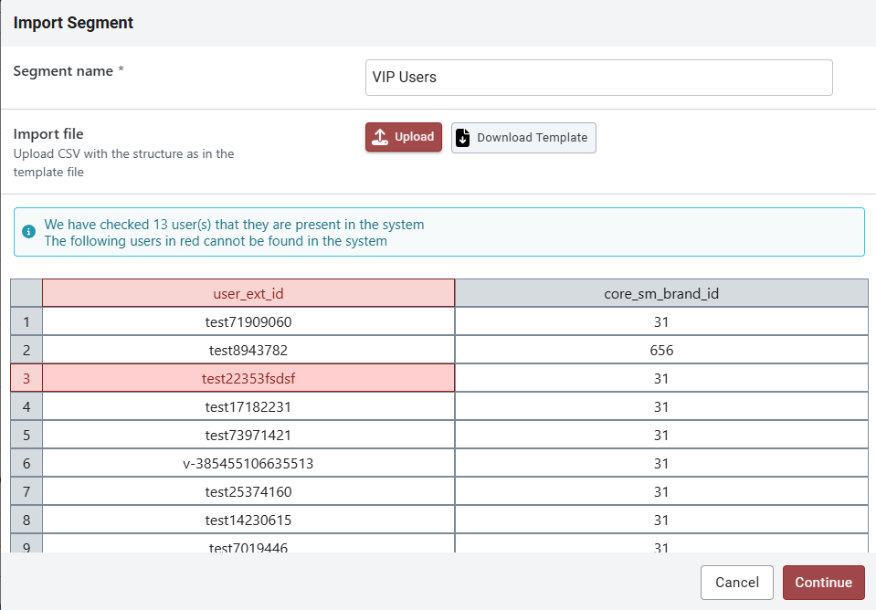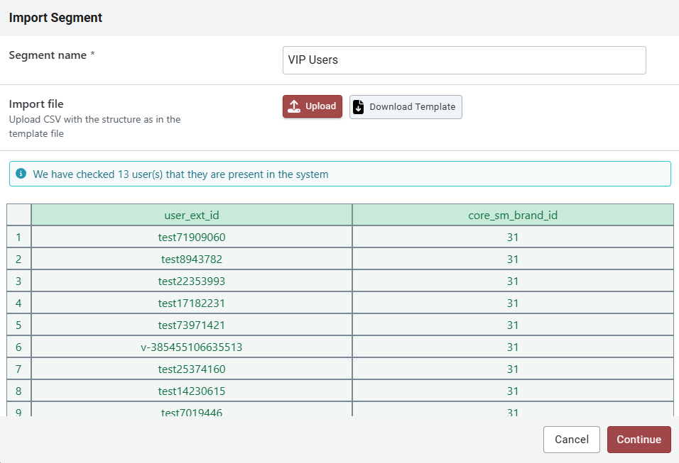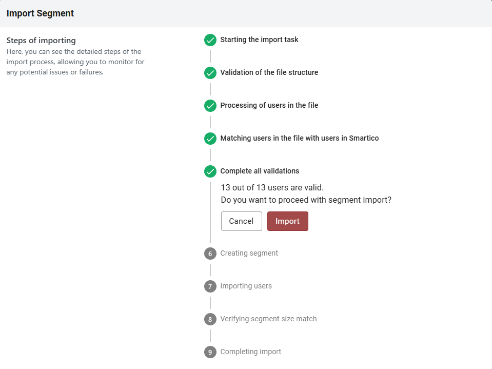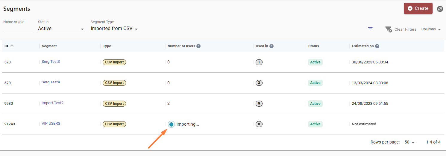 If you choose to proceed with importing the CSV file, the import process will begin, and the segment will be created. However, it will remain in the 'Importing' status until all users are successfully imported.