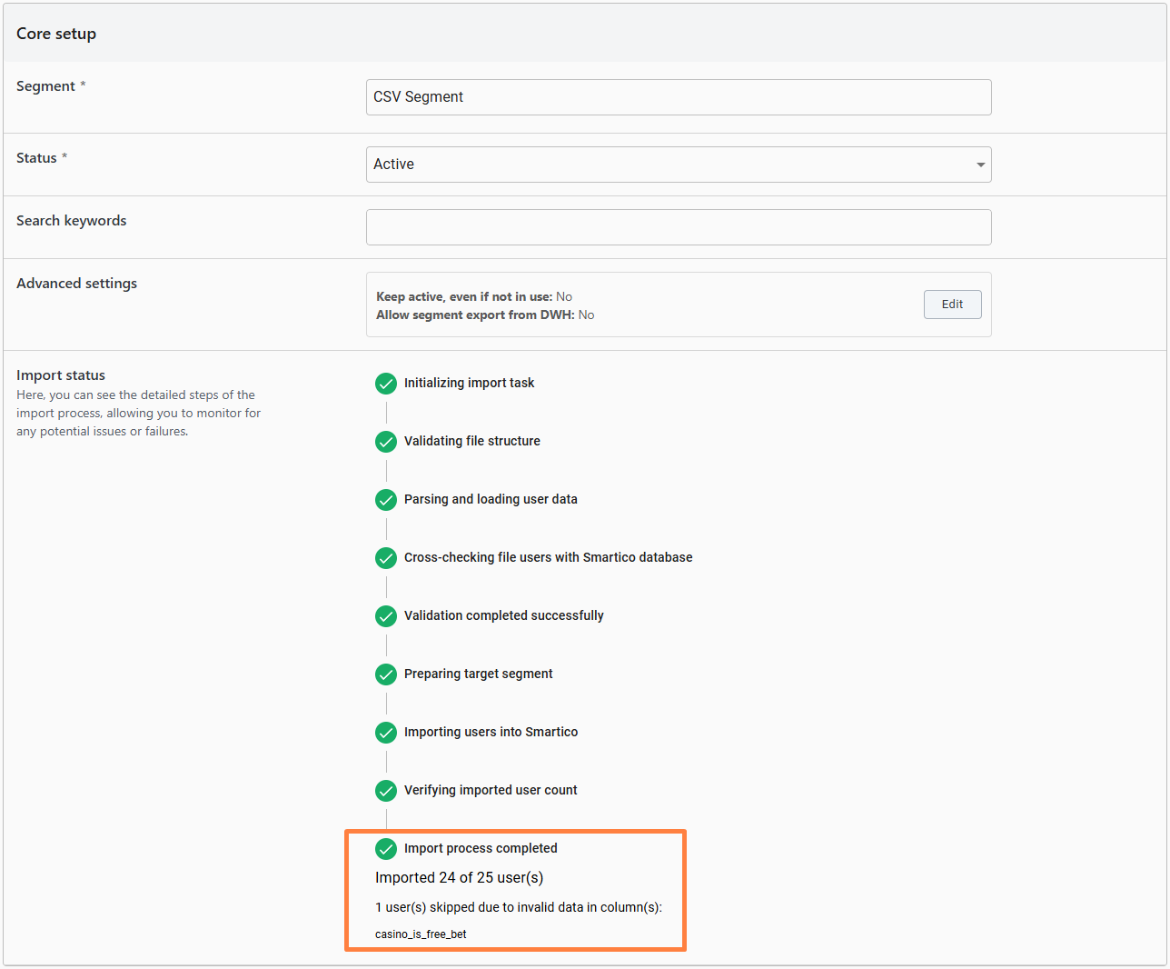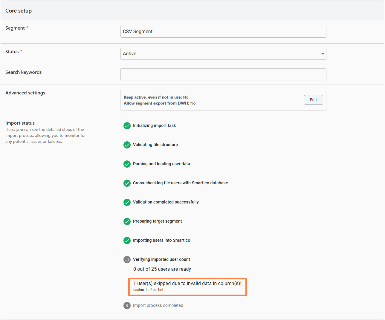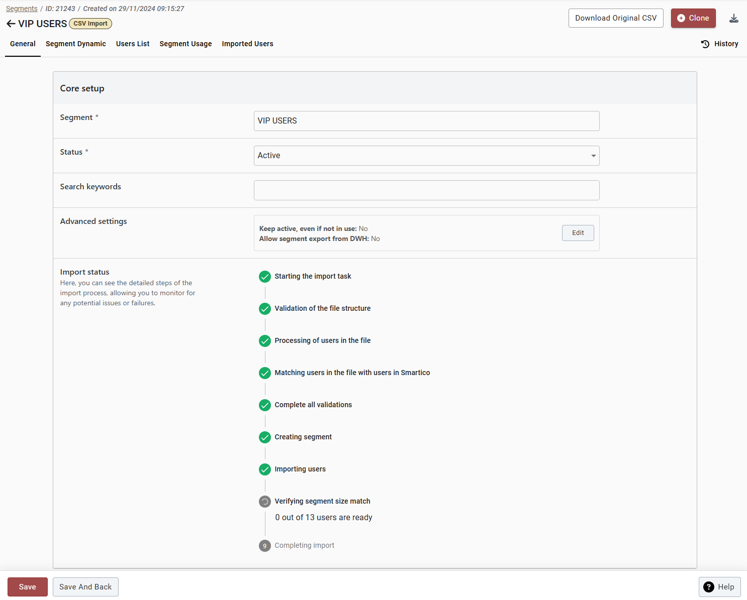 If you choose to proceed with importing the CSV file, the import process will begin, and the segment will be created. However, it will remain in the 'Importing' status until all users are successfully imported.
