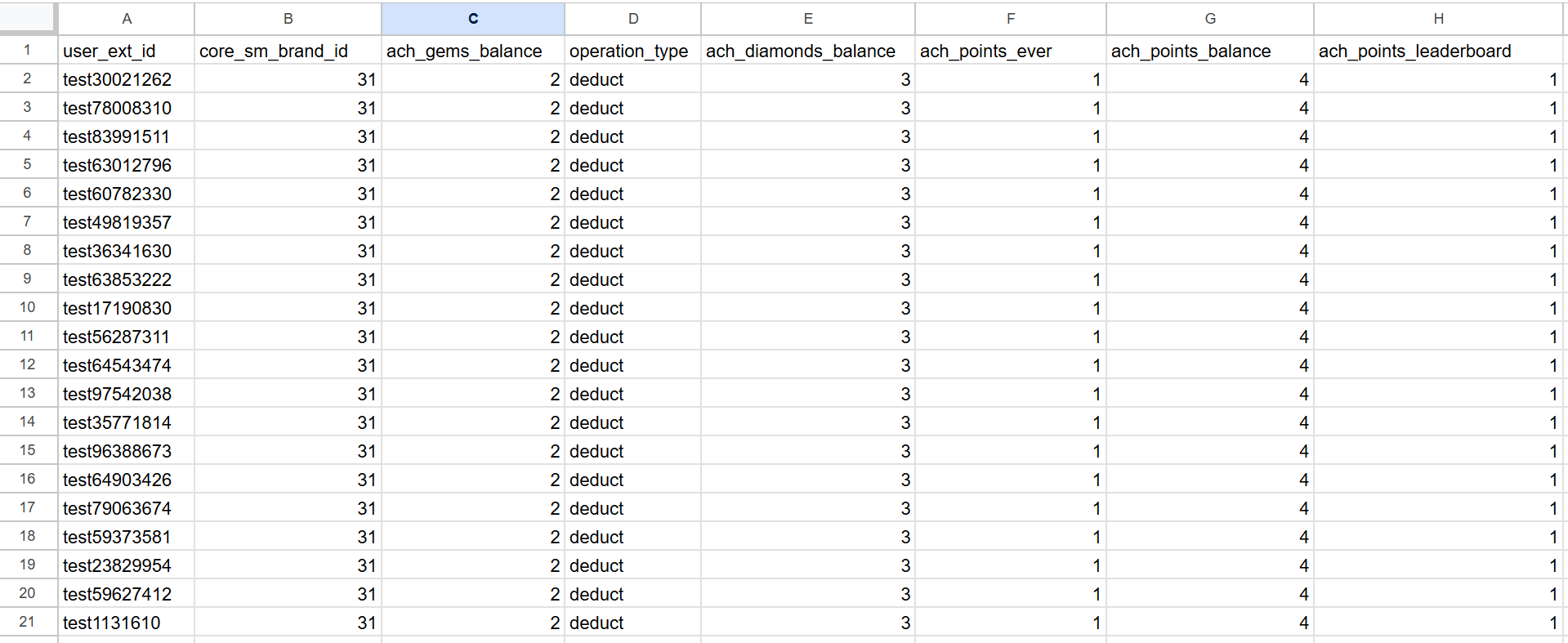 However, you can apply different operations per user. For instance, you can add points and gems for one user and deduct them for another within the same CSV file. Below is an example of a CSV file that deducts points, gems, and diamonds from specific users.