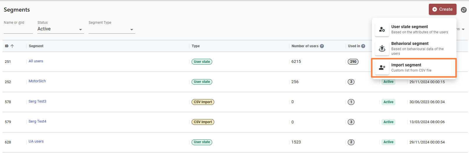 To create an imported segment navigate to the Segments section, click on the "Create" button, and select the "Import Segment" option: