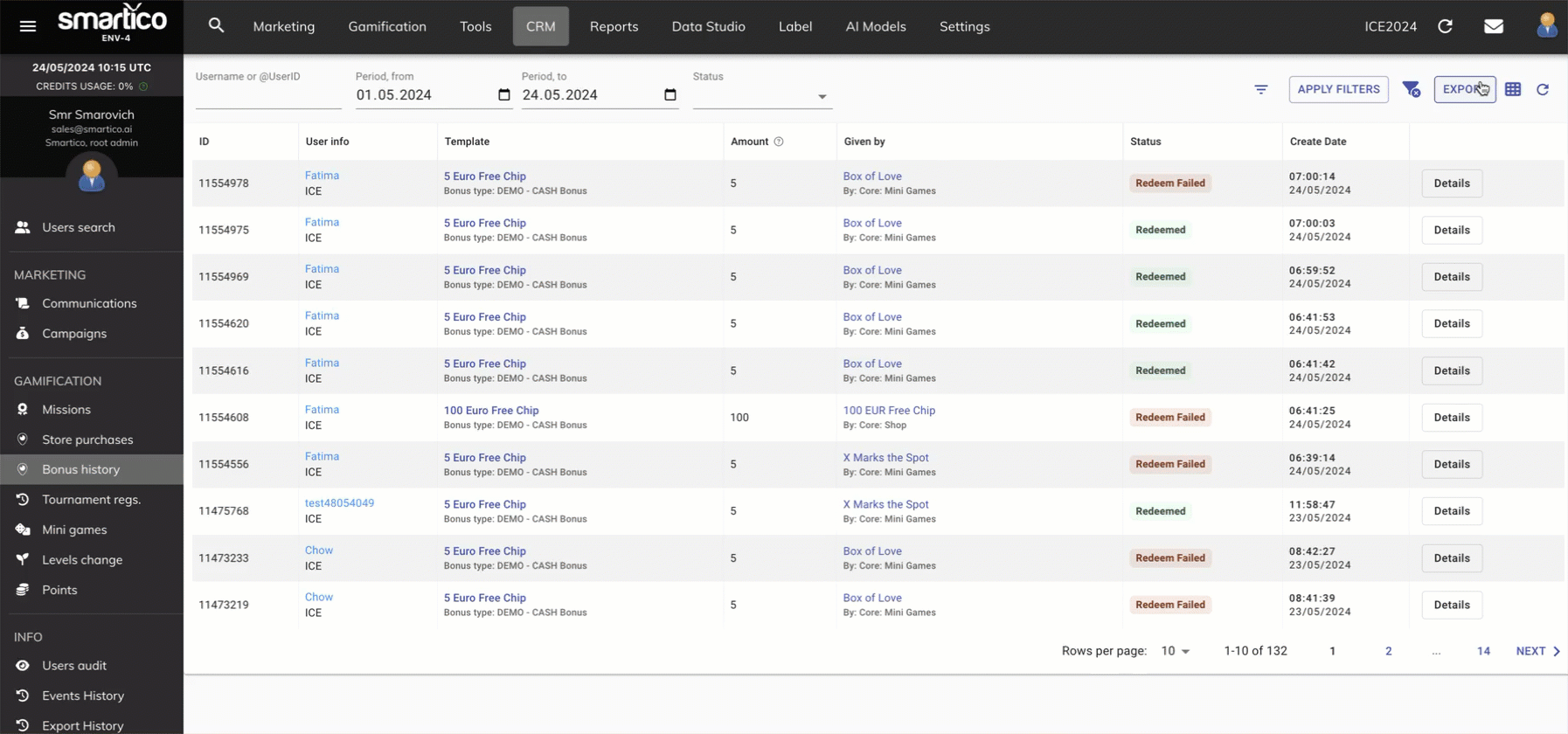 Bonus History can always be expanded to view the call made by Smartico and the response received by the platform: