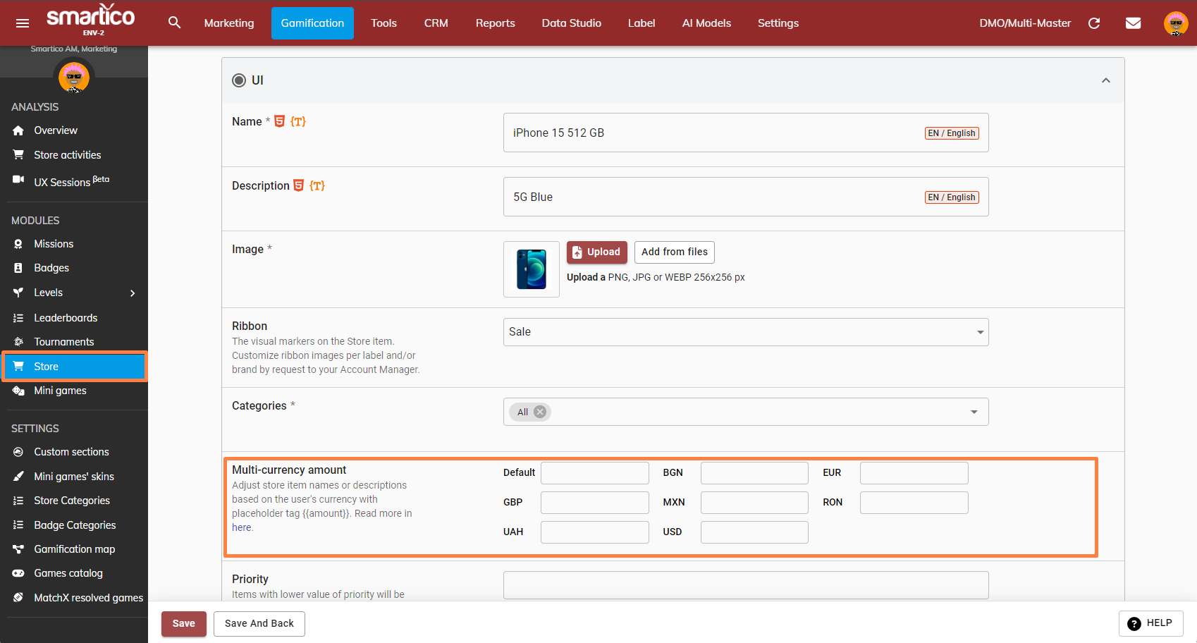 Multi-currency amount provides possibility to tune store item name or description according to the user currency. As soon as values are defined you can use them in the store item name and description with placeholder tag {{amount}}.