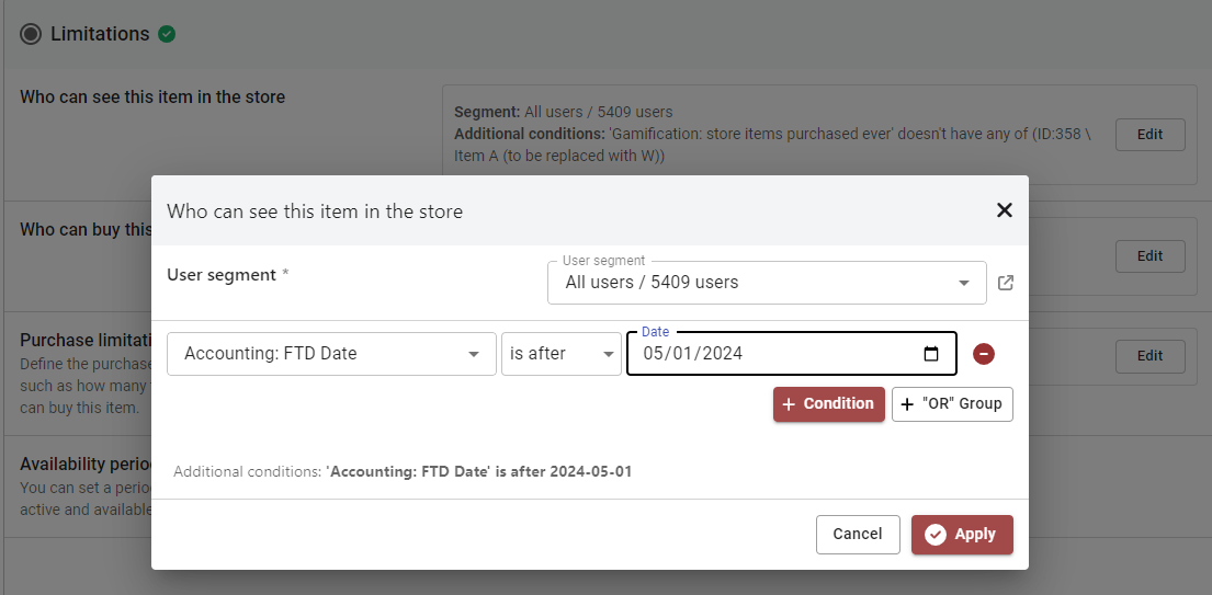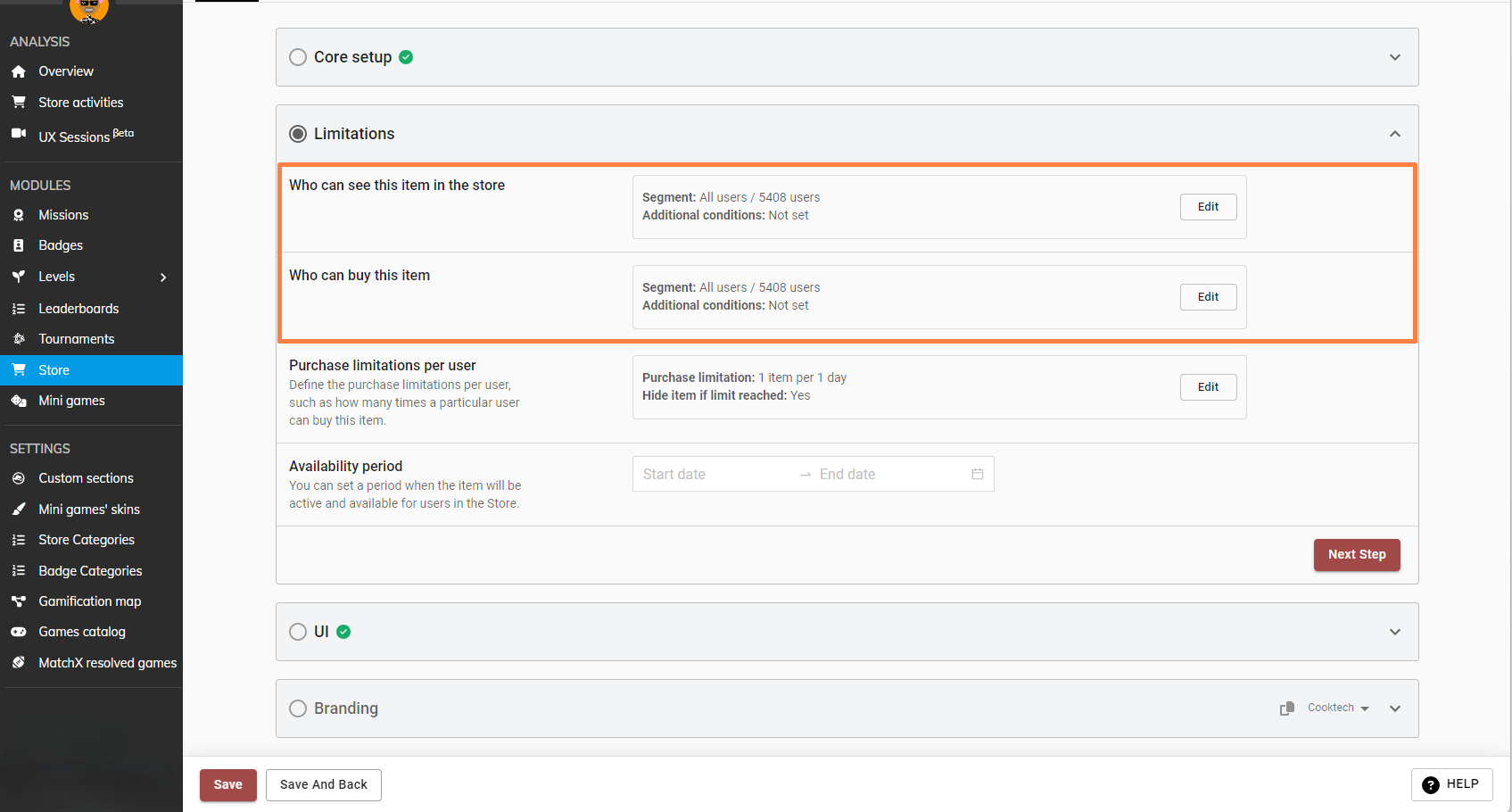<figure><img src="https://77049817-files.gitbook.io/~/files/v0/b/gitbook-x-prod.appspot.com/o/spaces%2FfS5hl0PiysHtKAKMsQTe%2Fuploads%2Fgit-blob-0cc98584078fc5864614ef8add4bdaf75c3dd101%2FStore%206.png?alt=media" alt=""><figcaption><p>Segment limitation in a store item</p></figcaption></figure>