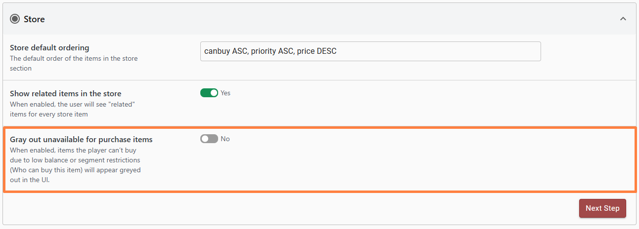 * Store items that players cannot purchase due to **insufficient balance** or because they are **outside the 'Who can buy this item' segment** are automatically displayed as **greyed out** in the UI.