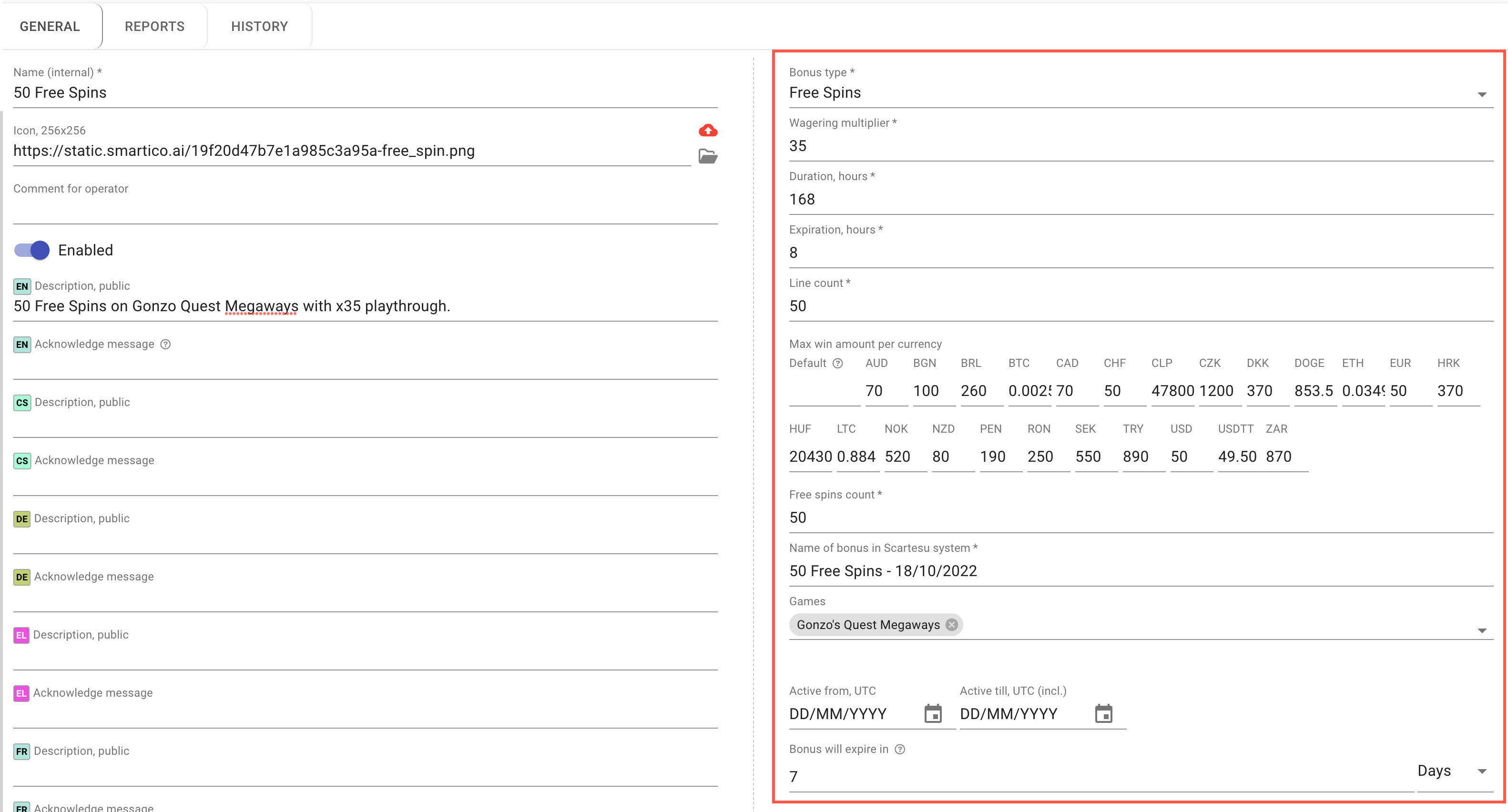 In some cases, issuing a bonus will require only user ID and amount to trigger a bonus template on the platform side, and in other cases more complex configuration is handled by Smartico to compensate lack of flexibility on the platform bonus system, see below: