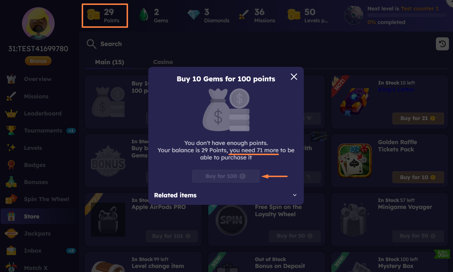 * The message is fully translation-based, which means it can be customized. If you do not want to display the exact number of missing points, you can simply edit the translation and remove the <mark style="color:purple;">`{points_missing}`</mark> <mark style="color:purple;">`{gems_missing}`</mark> <mark style="color:purple;">`{diamonds_missing}`</mark> tags.