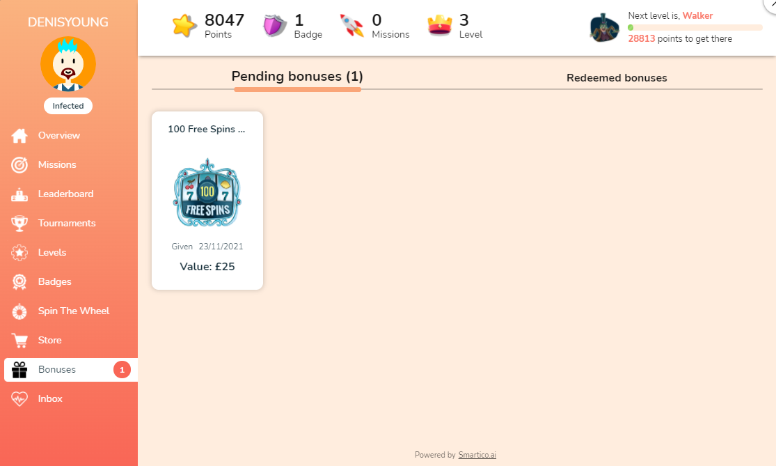<figure><img src="https://77049817-files.gitbook.io/~/files/v0/b/gitbook-x-prod.appspot.com/o/spaces%2FfS5hl0PiysHtKAKMsQTe%2Fuploads%2Fgit-blob-8023f500e7d06330020b110797642135e83f0357%2F7?alt=media" alt=""><figcaption><p>A pending for redemption bonus in the Gamification widget</p></figcaption></figure>