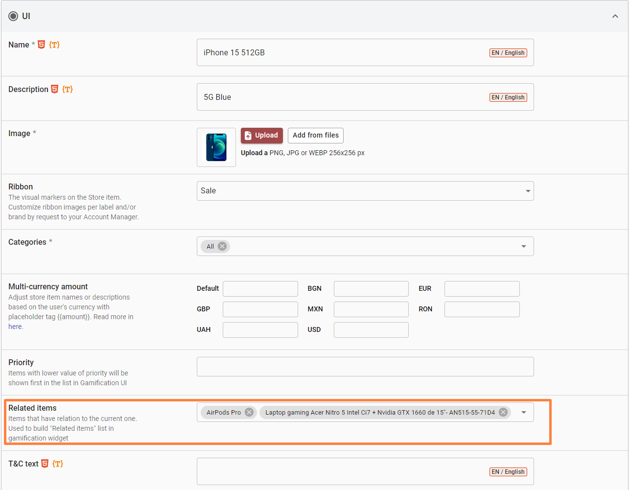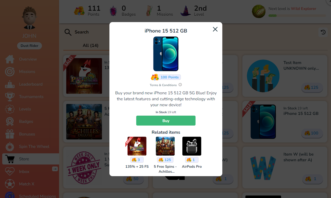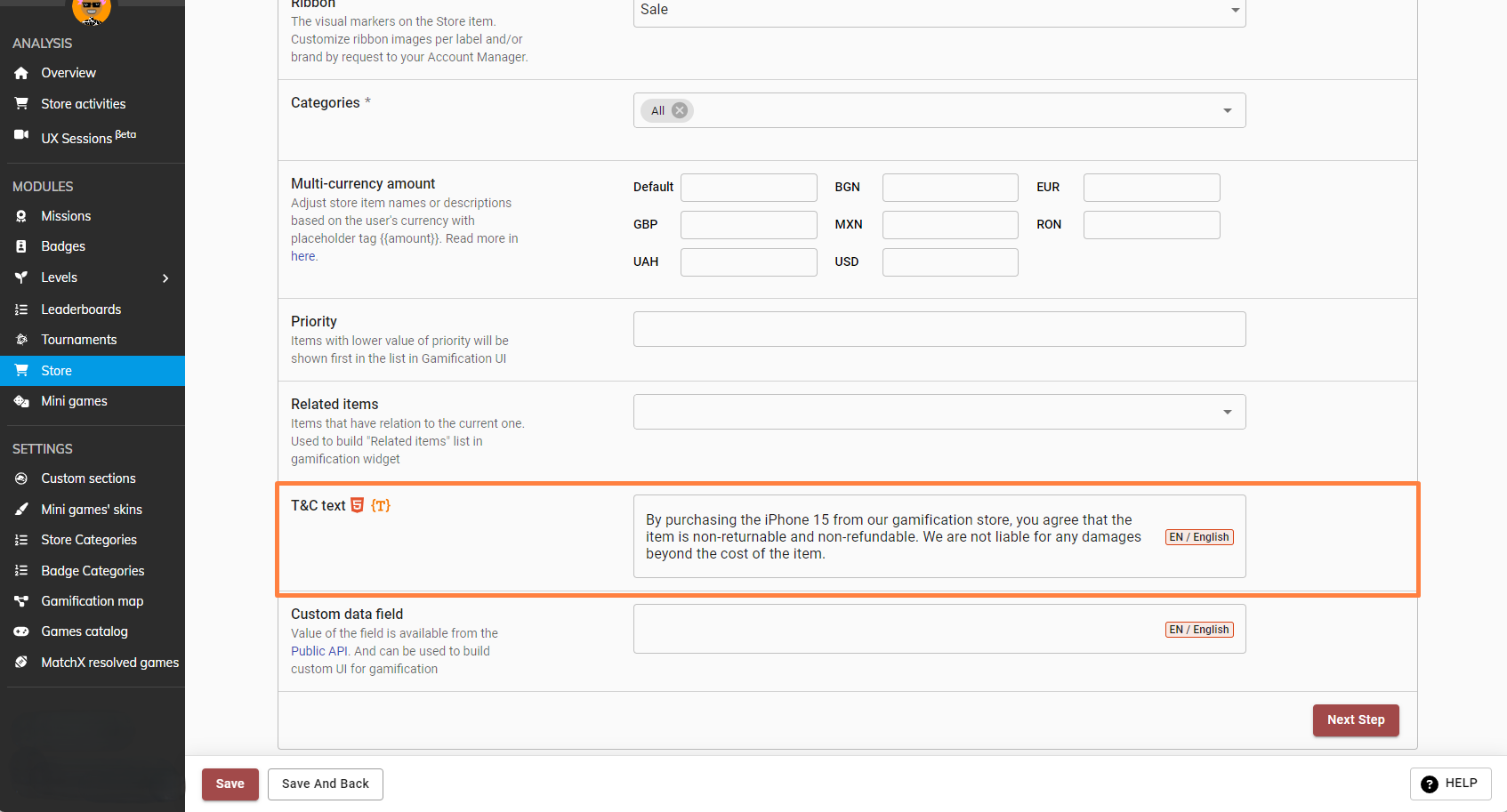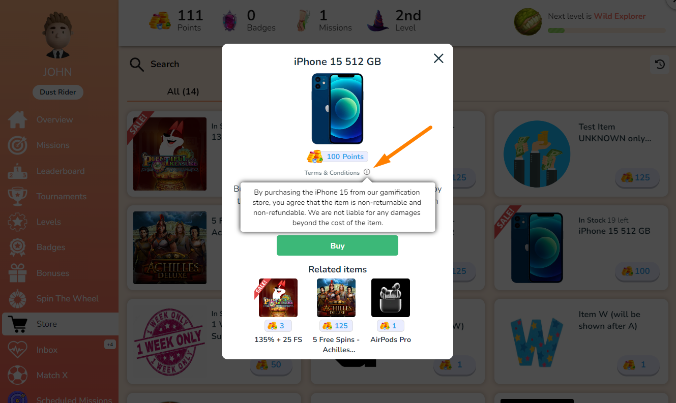 You can also add Terms & Conditions to the items in the Store. For example, if you offer some kind of a bonus in the store, you have the ability to add extra information or conditions. It is optional so if you don’t add any text from the BO, the T\&C hint will not be displayed inside the store item.