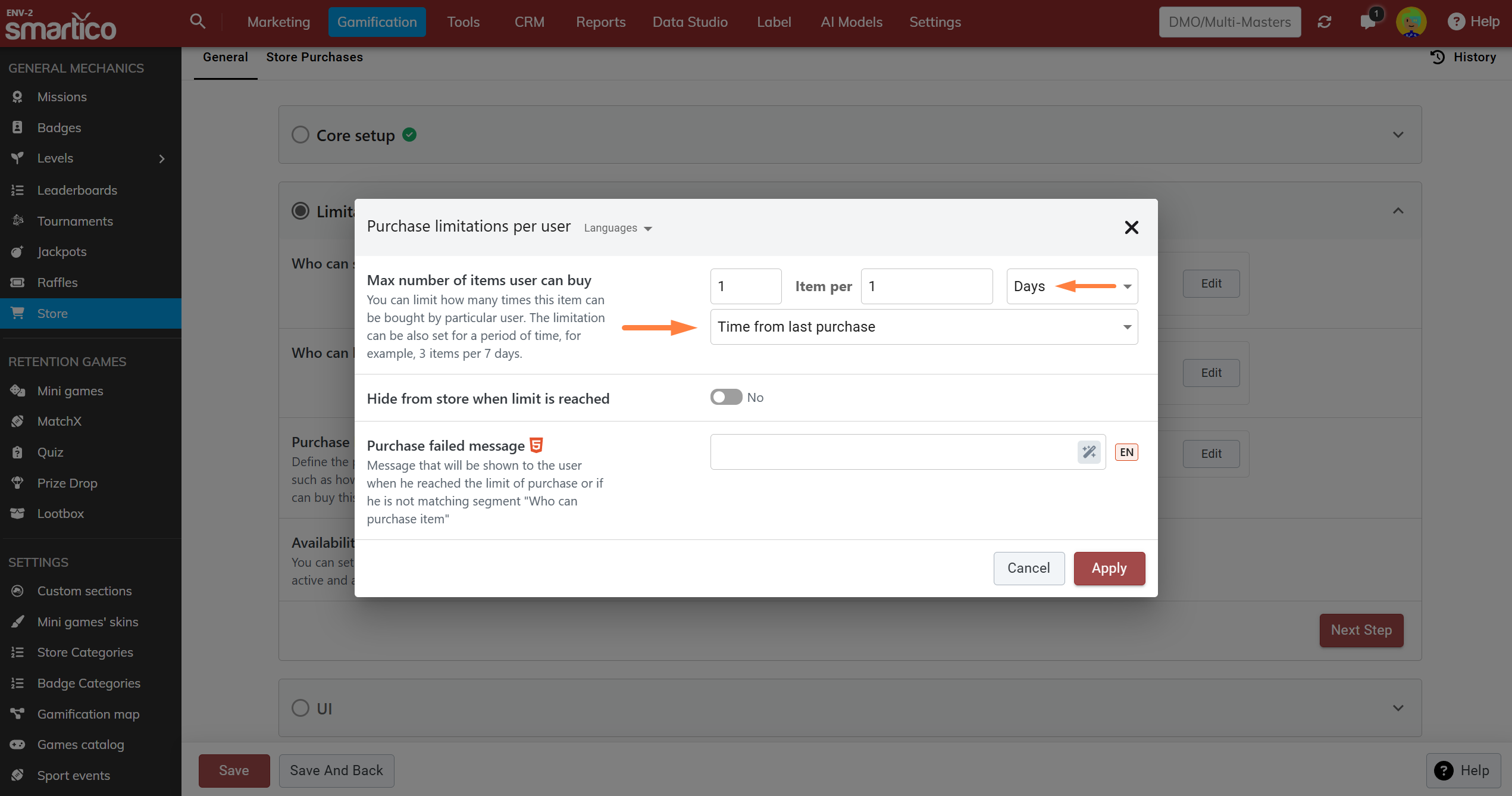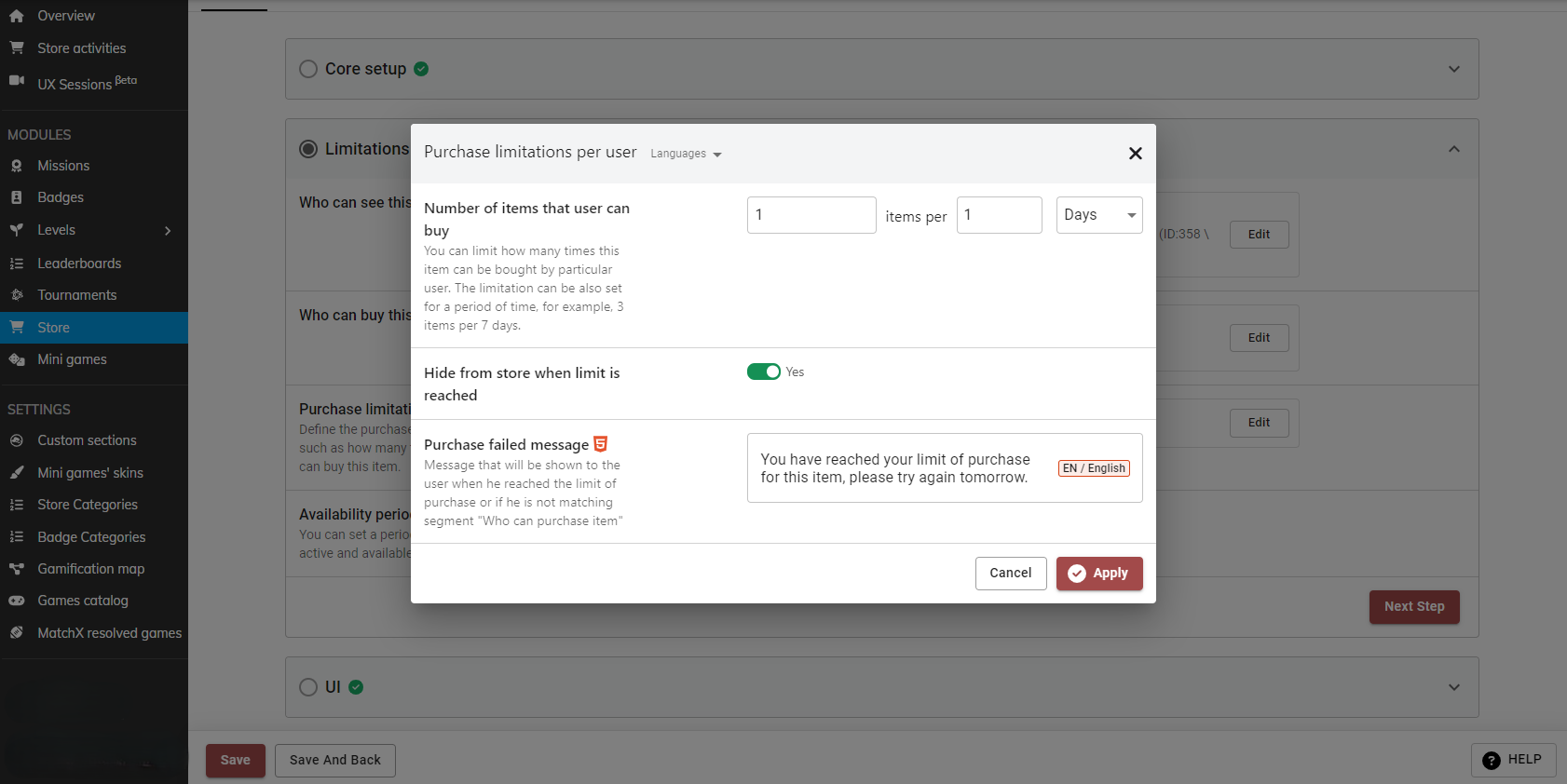<figure><img src="https://77049817-files.gitbook.io/~/files/v0/b/gitbook-x-prod.appspot.com/o/spaces%2FfS5hl0PiysHtKAKMsQTe%2Fuploads%2Fgit-blob-9b8fa6aaf68ec3b71506621d7230fddbc169ad72%2Fstore%205.png?alt=media" alt=""><figcaption><p>Store item purchase limitation</p></figcaption></figure>