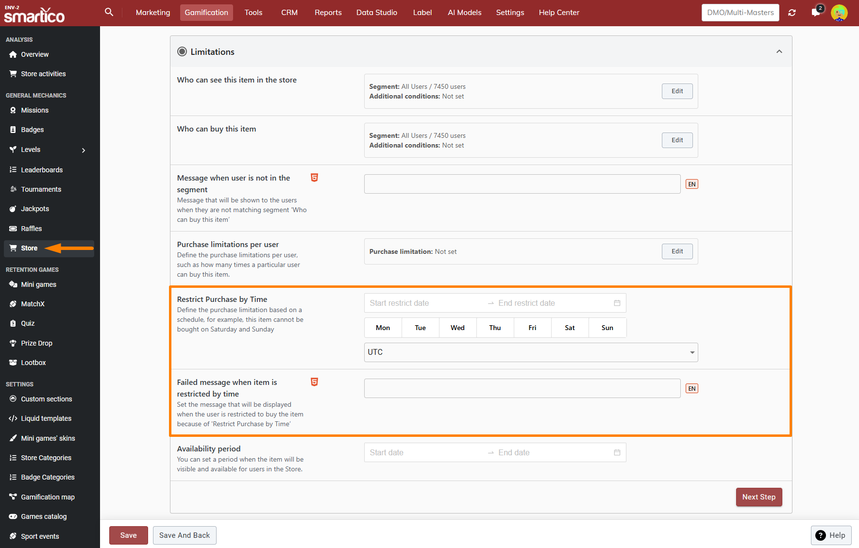 <figure><img src="https://77049817-files.gitbook.io/~/files/v0/b/gitbook-x-prod.appspot.com/o/spaces%2FfS5hl0PiysHtKAKMsQTe%2Fuploads%2Fgit-blob-c599a88dbf1944e98d099690d4b034ba9c281126%2FScreenshot_5.png?alt=media" alt=""><figcaption><p>BO: Restrict purchase by time in Store items</p></figcaption></figure>