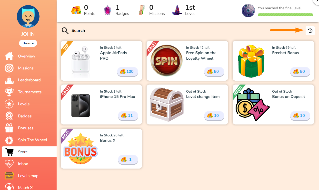 The purchase history can be found in the Store section in the Gamification Widget. Players can view all items they've purchased, including details such as cost, availability for repurchase, stock status (if managed by the operator), purchase date, and a "Buy Again" button.