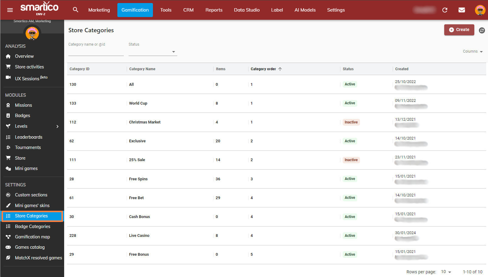 To create new categories move to the Gamification tab -> Settings: Store Categories -> Create