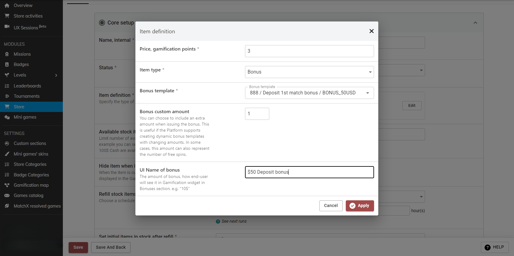 The Bonus items in the Store are based on Bonus Templates which are created separately in the Bonus Templates interface (see <mark style="color:red;">Bonus templates</mark>)