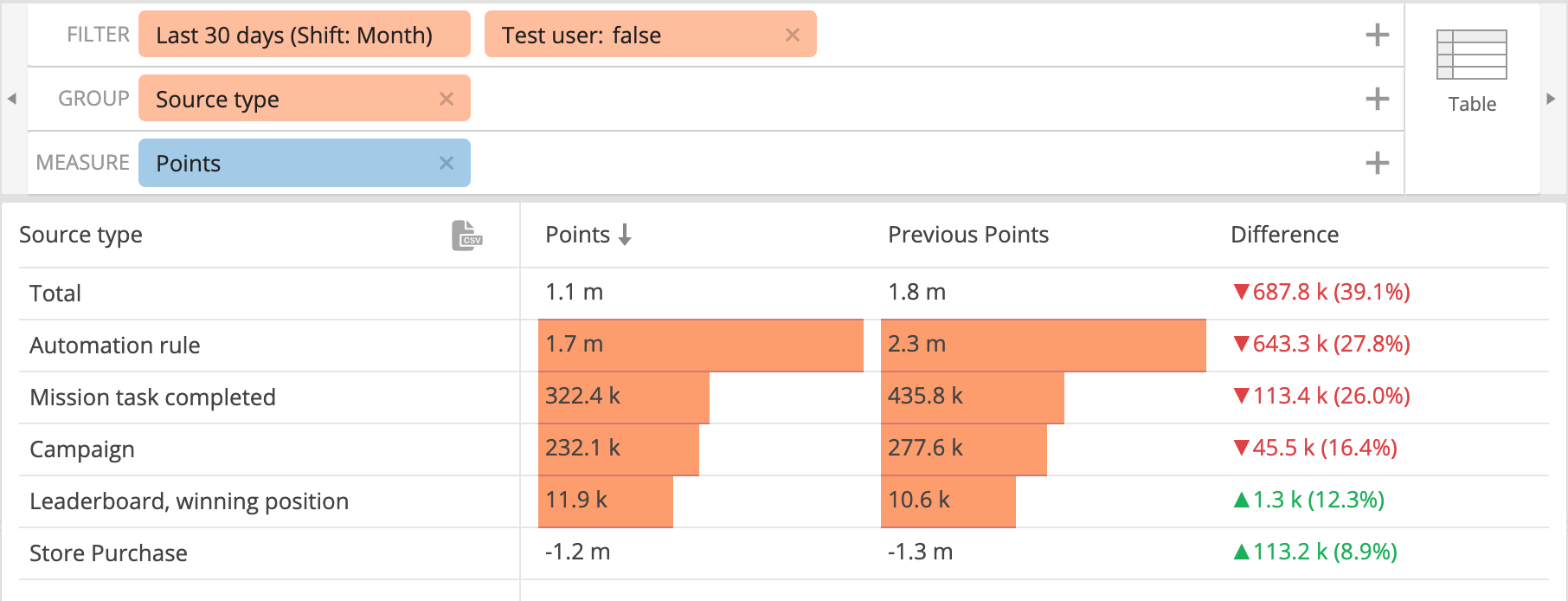 Once gamification is active, you can begin analyzing player behavior across different point sources. One key metric to monitor is the **ratio of Points Collected to Points Spent in the Marketplace**. This ratio serves as a strong indicator of player engagement - highlighting how actively your audience participates in earning rewards and how motivated they are to spend them.