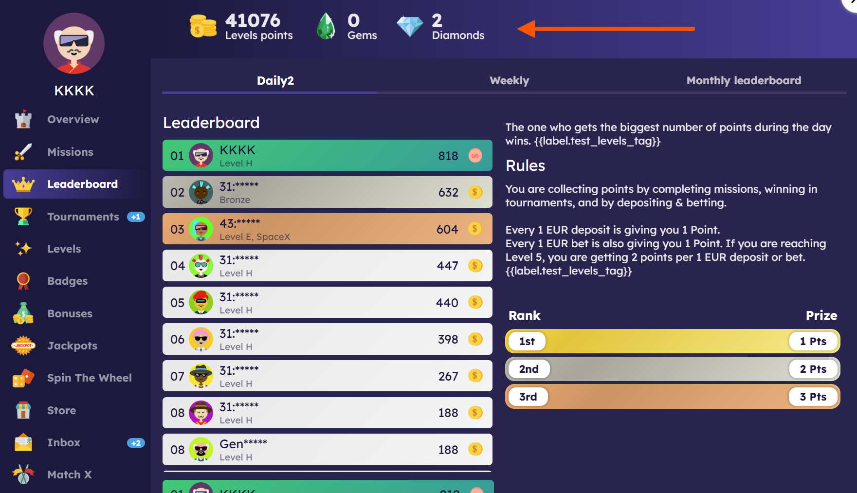 <figure><img src="https://77049817-files.gitbook.io/~/files/v0/b/gitbook-x-prod.appspot.com/o/spaces%2FfS5hl0PiysHtKAKMsQTe%2Fuploads%2Fgit-blob-b65828e89bf4445f4447c893a570946ad9b1d10c%2Fimage.png?alt=media" alt=""><figcaption><p>Gamification: Visualisations of Gems and Diamonds in the header</p></figcaption></figure>
