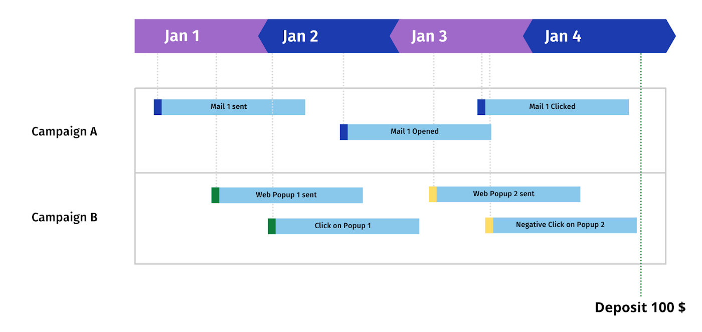 The attribution model will exclude negative reactions (in our case Web Popup 2) and take into account only player-originated actions — Open mail 1, click the link in mail 1 and click in Web Popup 1.