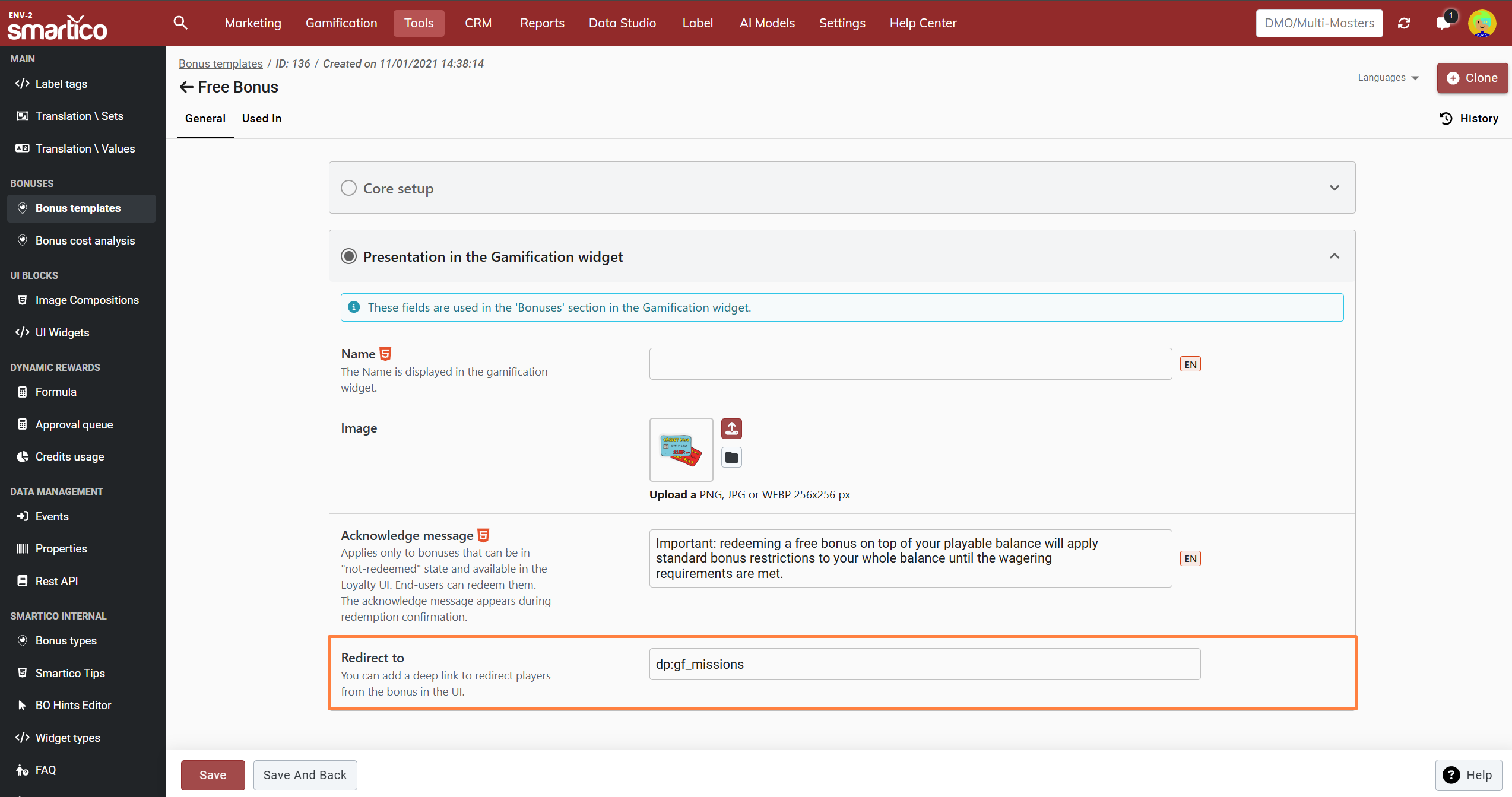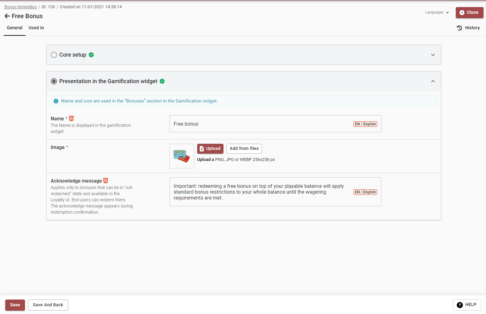 Bonus types are configurable on the platform’s side. They could be for example Cash bonuses, Free Spins, or Coupon Code. To issue a bonus with Smartico, the operator should create a bonus template in our BO, where the bonus type should be added. In the template, there are options to set an icon, public name (how the bonus will be displayed to end-users), bonus activity period (active from/till), bonus type (cash bonus, free spins), and expiration period (365 days).