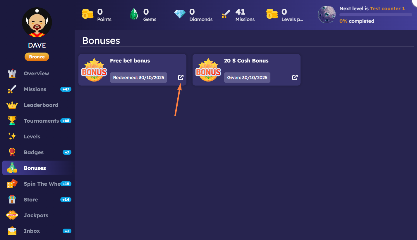 <figure><img src="https://77049817-files.gitbook.io/~/files/v0/b/gitbook-x-prod.appspot.com/o/spaces%2FfS5hl0PiysHtKAKMsQTe%2Fuploads%2Fgit-blob-318ec568708723d3bc8b89163fe57ce058a8a28e%2FScreenshot_32.png?alt=media" alt=""><figcaption><p>Example of Bonus set as a prize in mini-game</p></figcaption></figure>