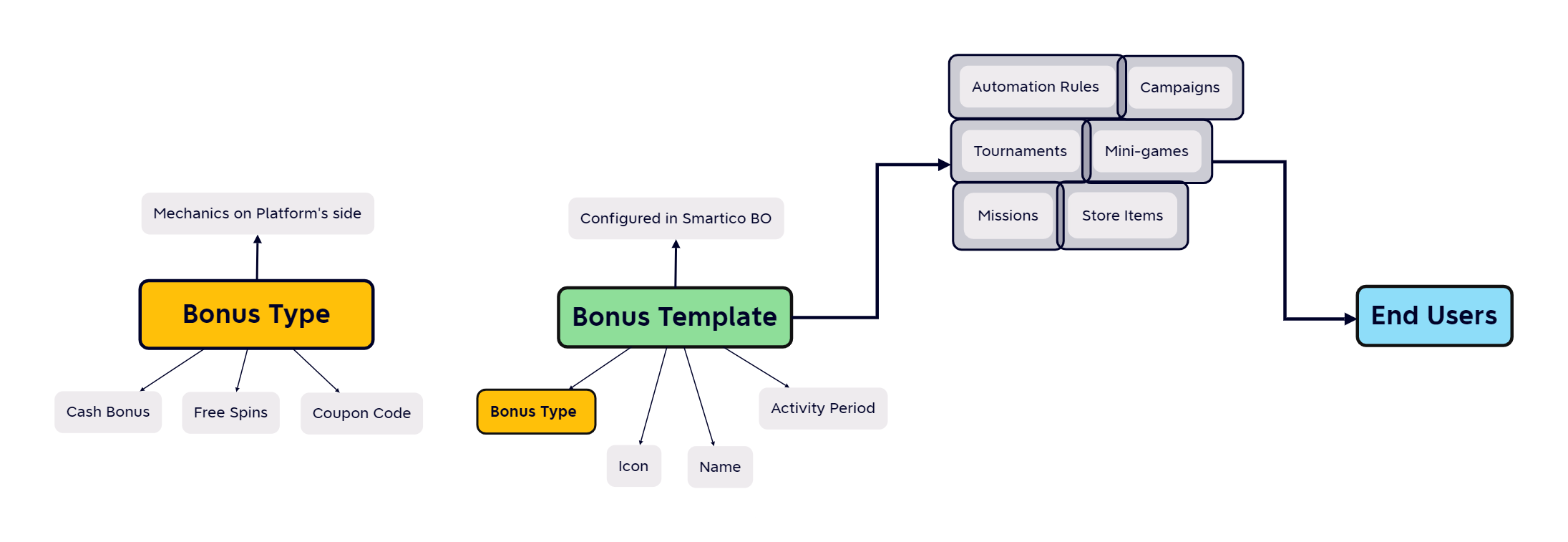 Smartico is getting the list of the available bonuses from the platform and is issuing the bonuses through the platform using an API. The general logic of such API look like "Give bonus X to the user Y", where the bonus X is identified by some unique name or ID, and all details of the bonus are managed on the side of the integrated system.