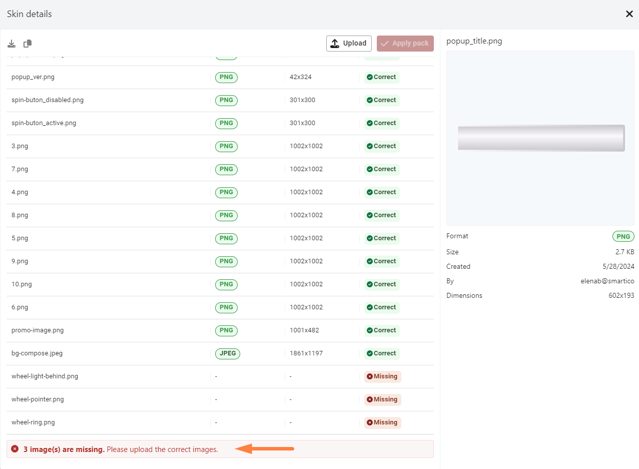 * The skin package for the new pop-ups includes different images. Make sure you're uploading the correct package that contains the new visuals.