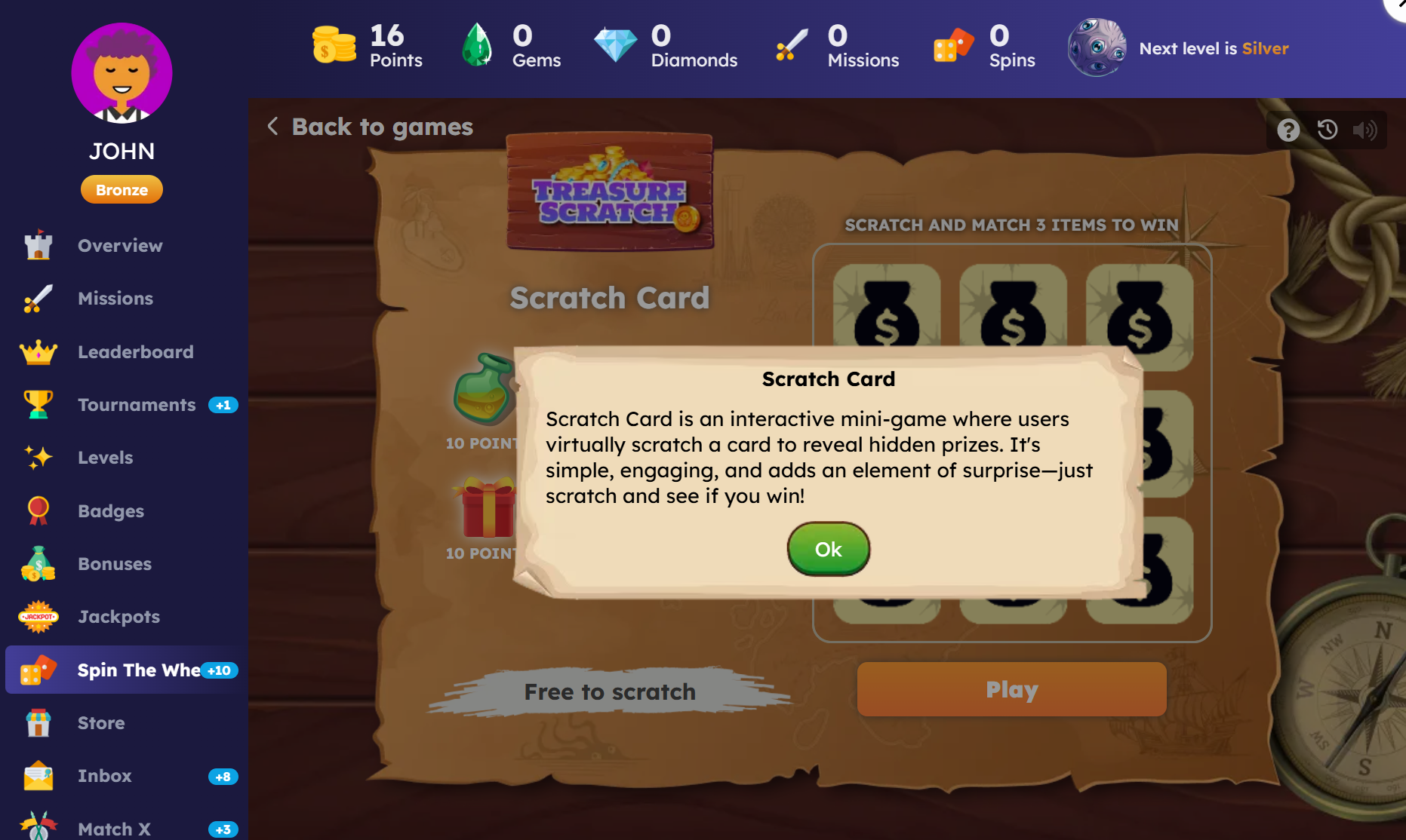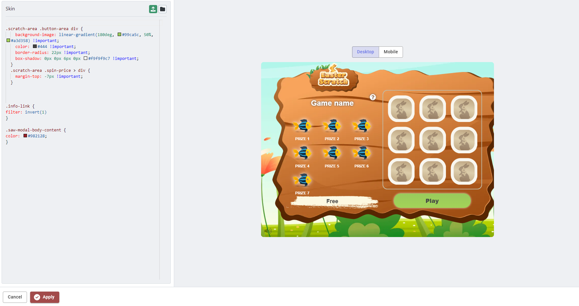 You can create Custom designs for the pop-ups inside the mini-games. The **‘Use new pop-ups’** option is available in the Mini-games Skins section in the BO.