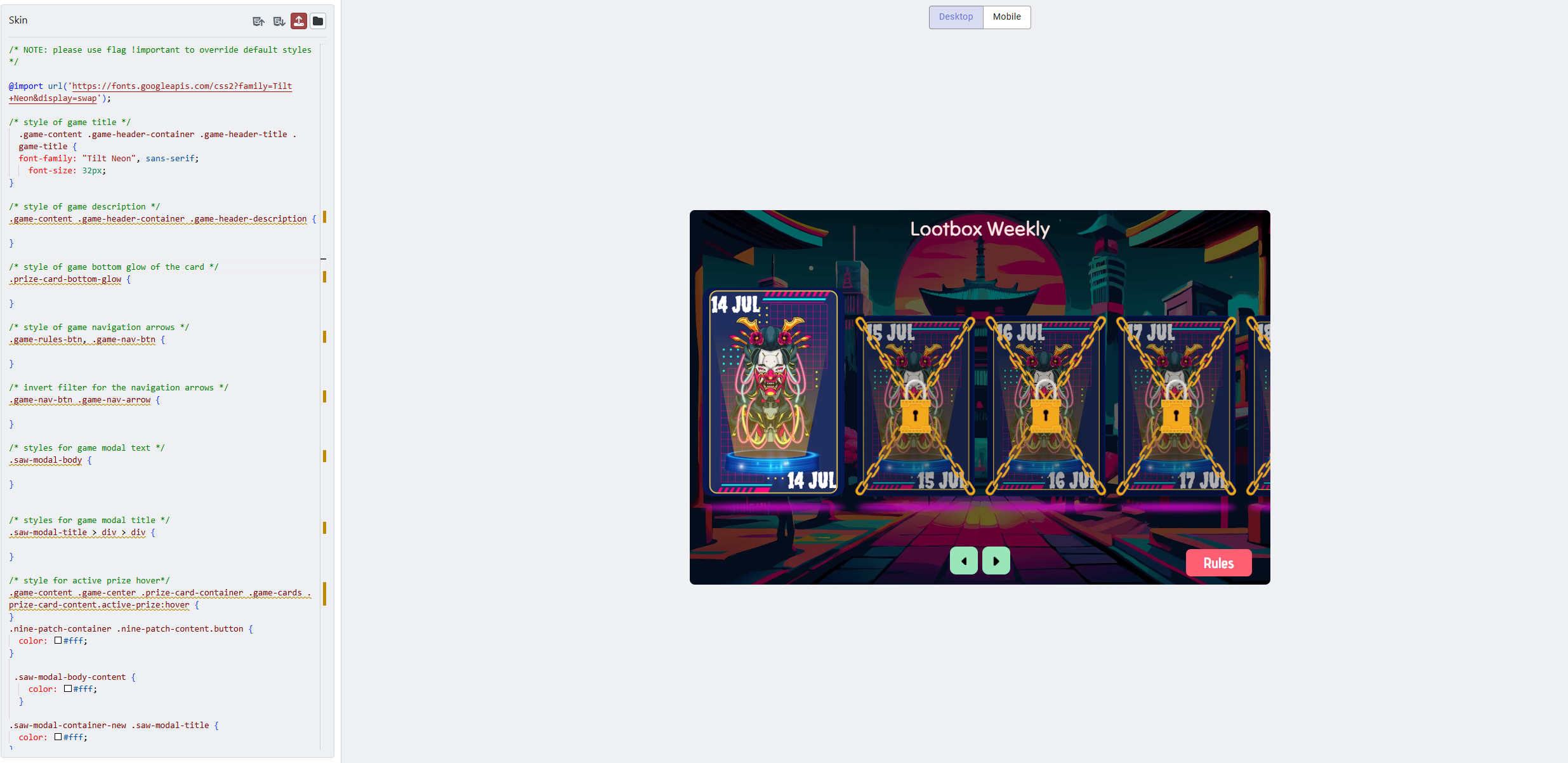<figure><img src="https://77049817-files.gitbook.io/~/files/v0/b/gitbook-x-prod.appspot.com/o/spaces%2FfS5hl0PiysHtKAKMsQTe%2Fuploads%2Fgit-blob-70741845497cafaa9d871b8ac43b0d68316201ce%2FScreenshot_29.png?alt=media" alt=""><figcaption><p>BO: CSS editor in Mini-game Skins</p></figcaption></figure>