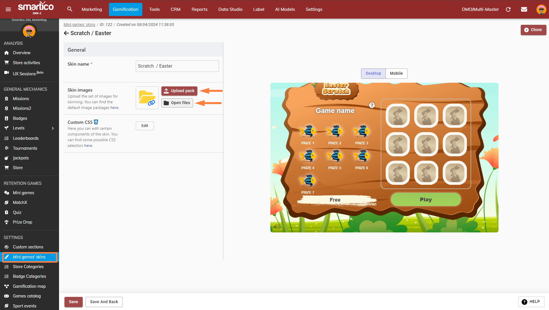You can prepare custom skin for the 'Spin the Wheel', 'Scratch Card', 'Treasure Hunt', 'Lootbox 2.0' and 'Giftbox' games directly from the Smartico Back Office by navigating to the **Gamification tab** and then to the **Mini games skin menu**