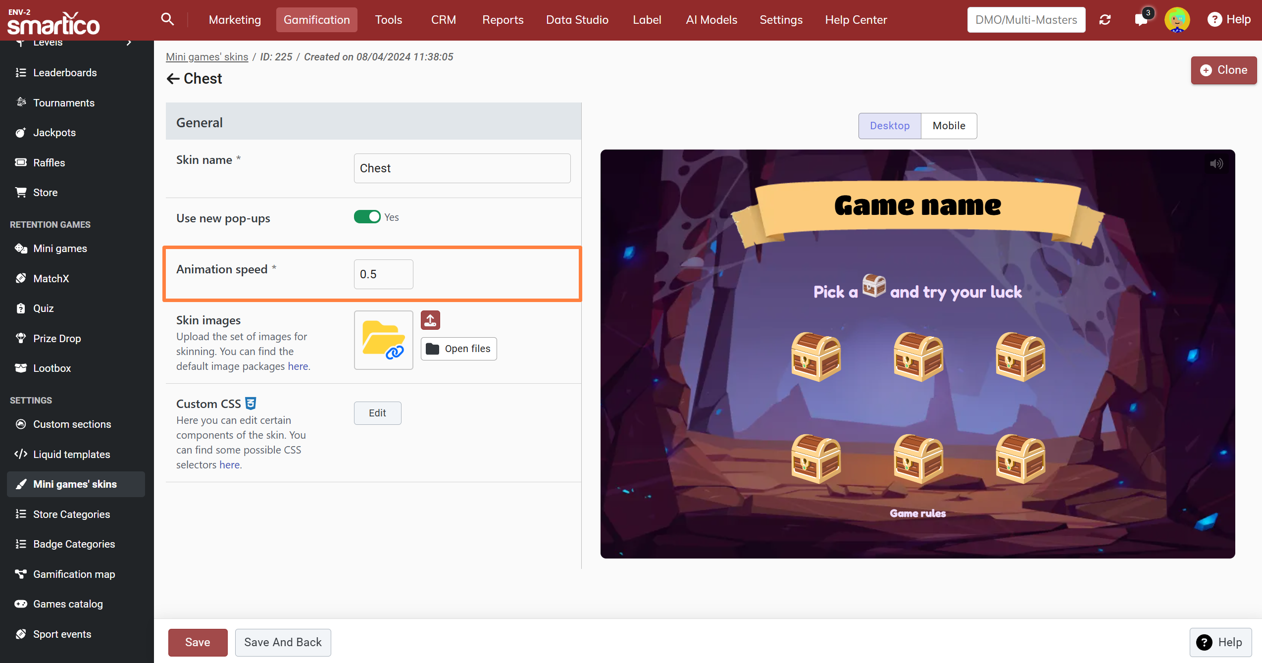 The opening animation of the Giftbox can be adjusted on skin level from the BO. The ‘Animation speed’ setting is set to 0.5 by default. You can choose any value between 0.1 (slowest) and 1 (fastest), giving you full control over how fast the opening giftbox animation plays.