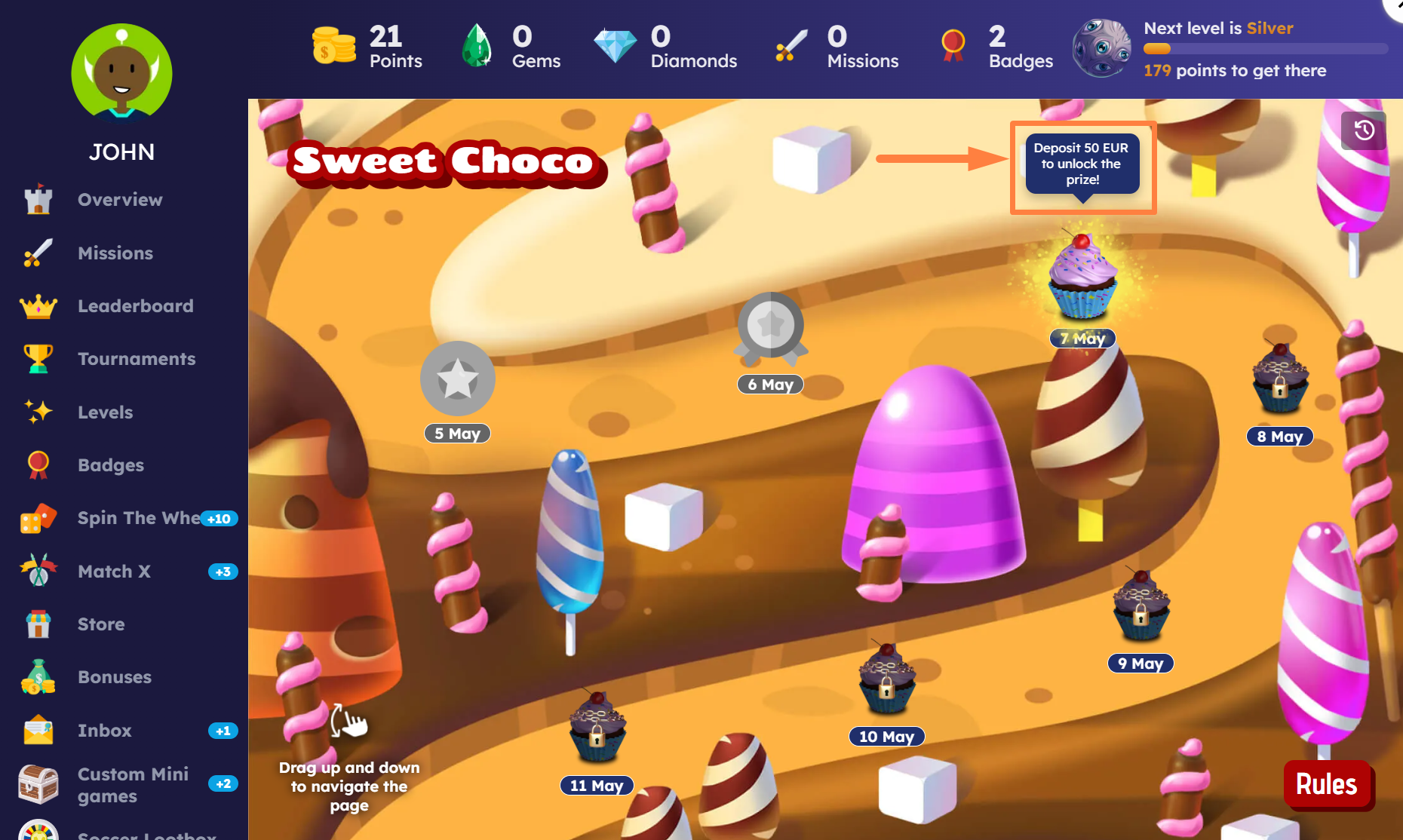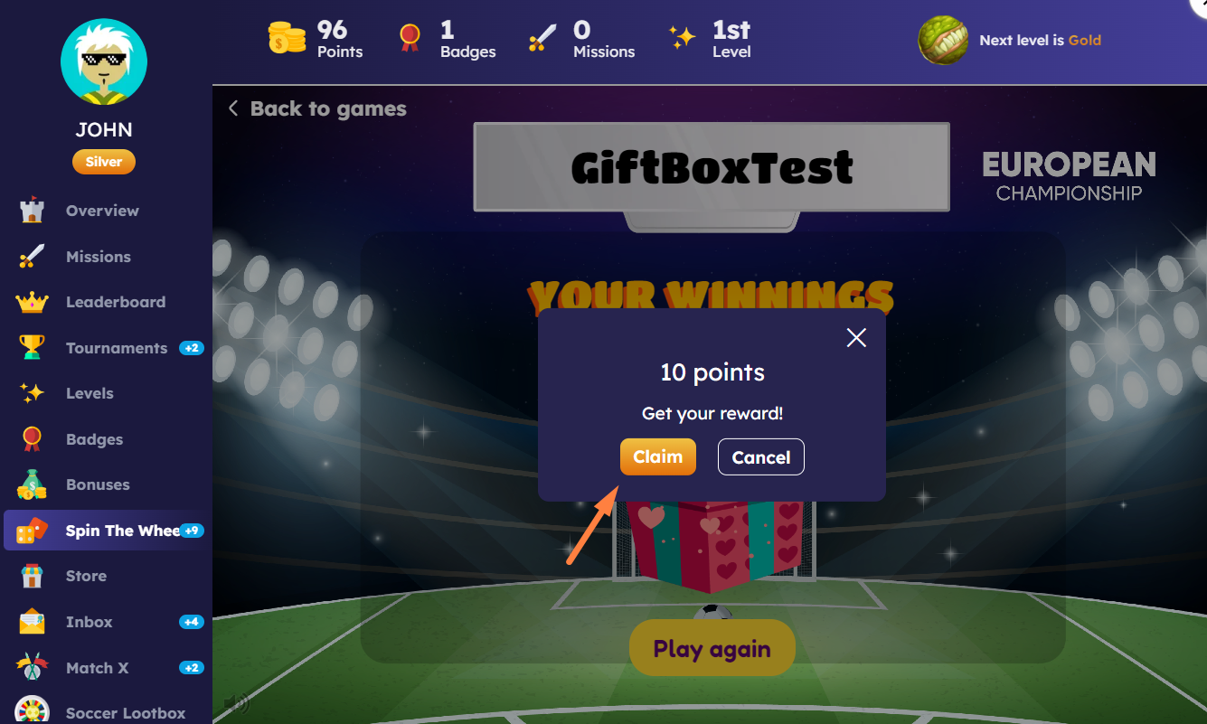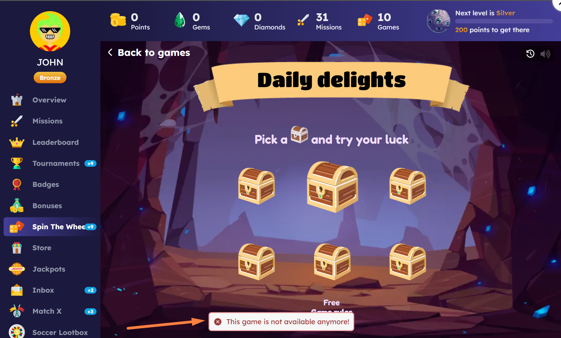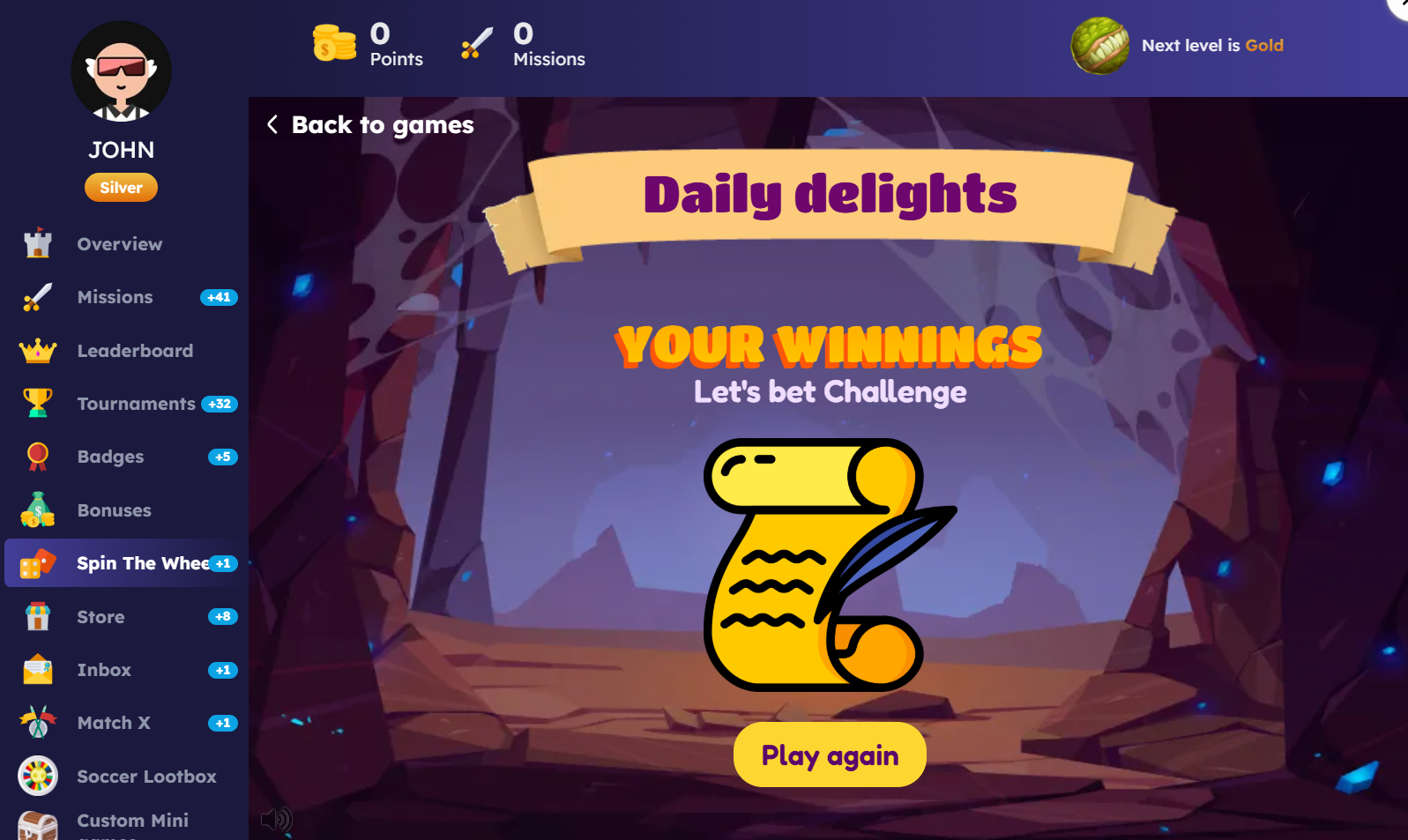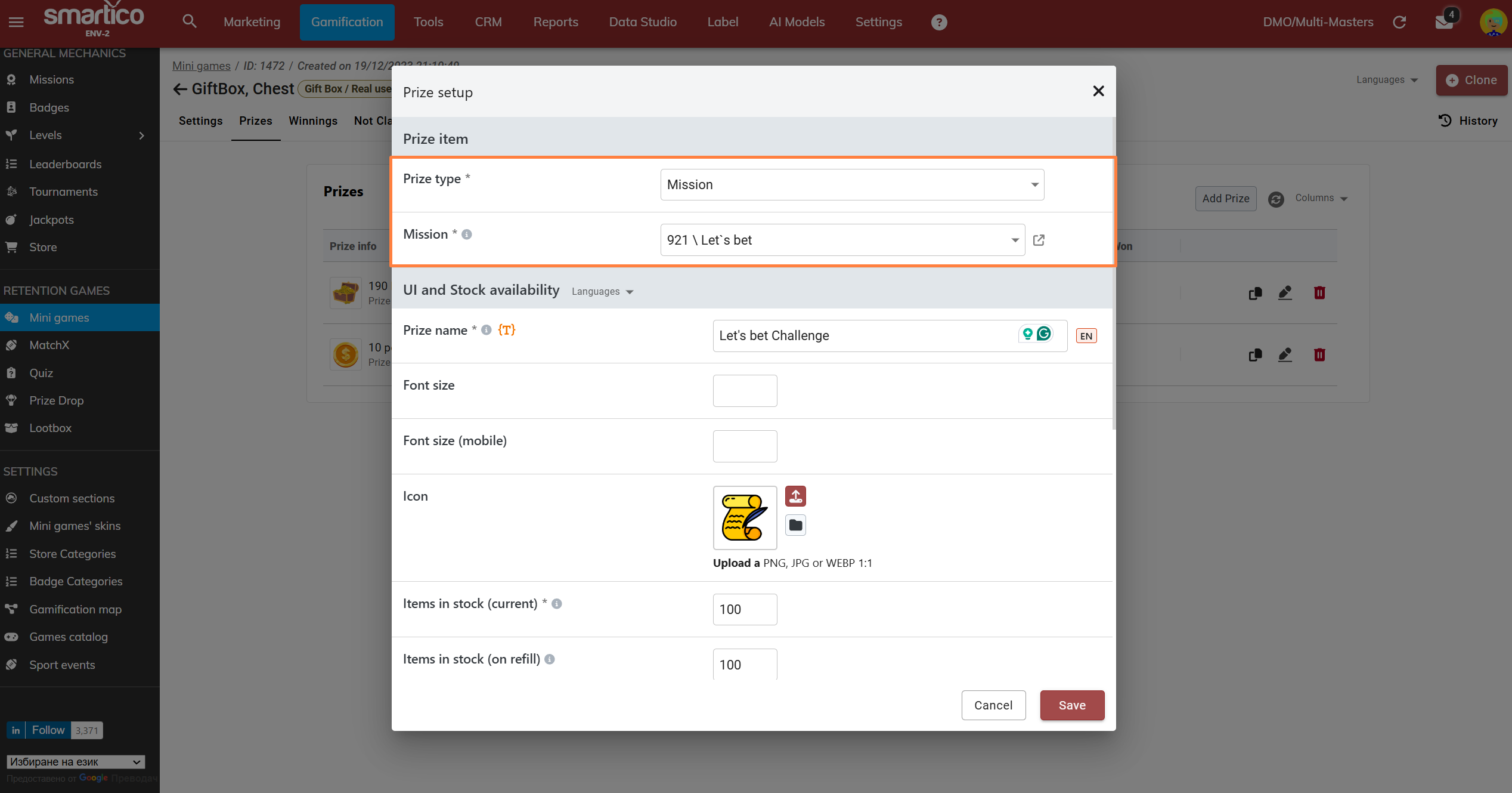 You can add missions as prize type for all mini-games. This new prize type can be configured in the BO under the Prizes tab. Note that only 'Featured Manually' missions can be selected as prizes.
