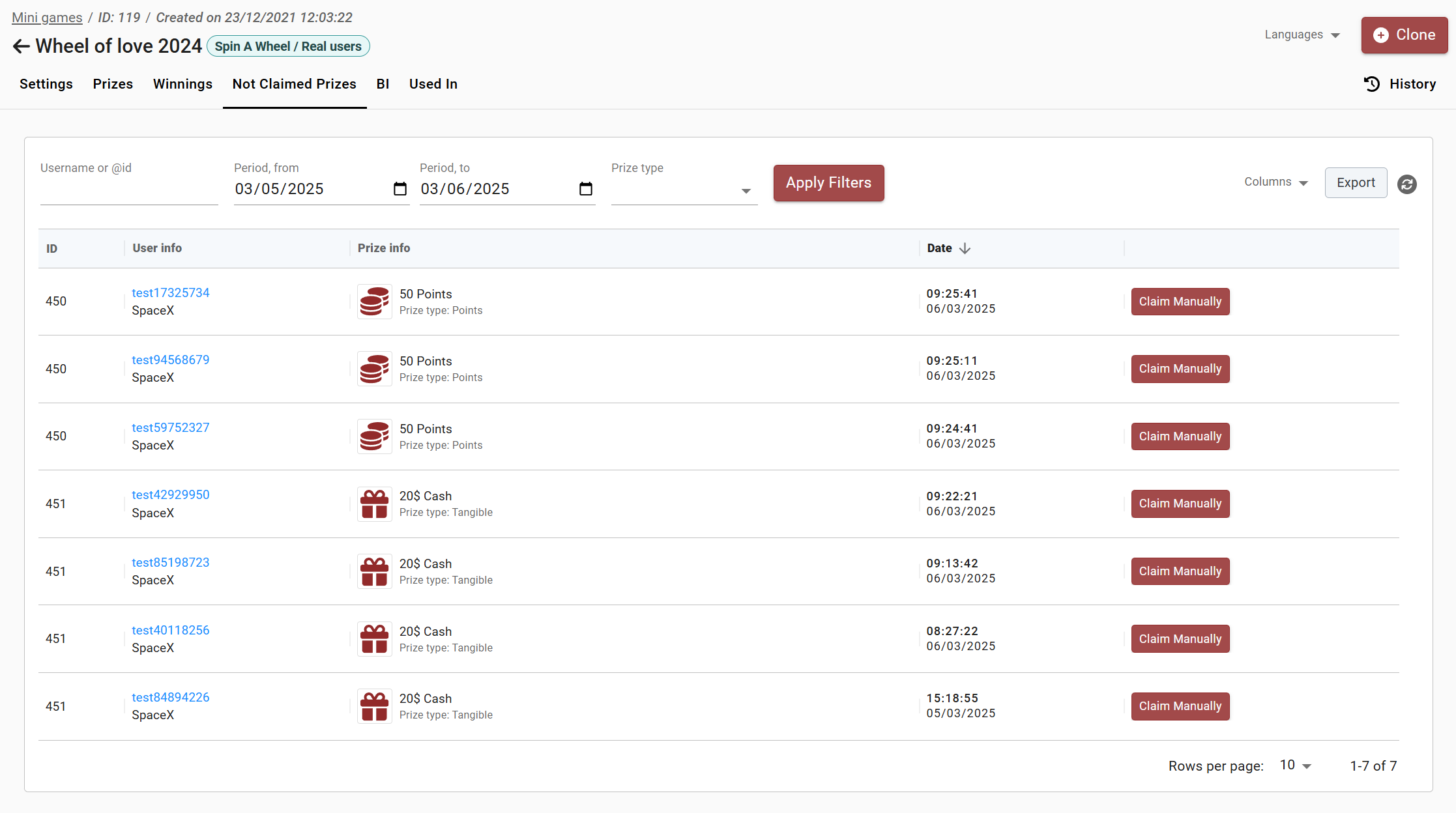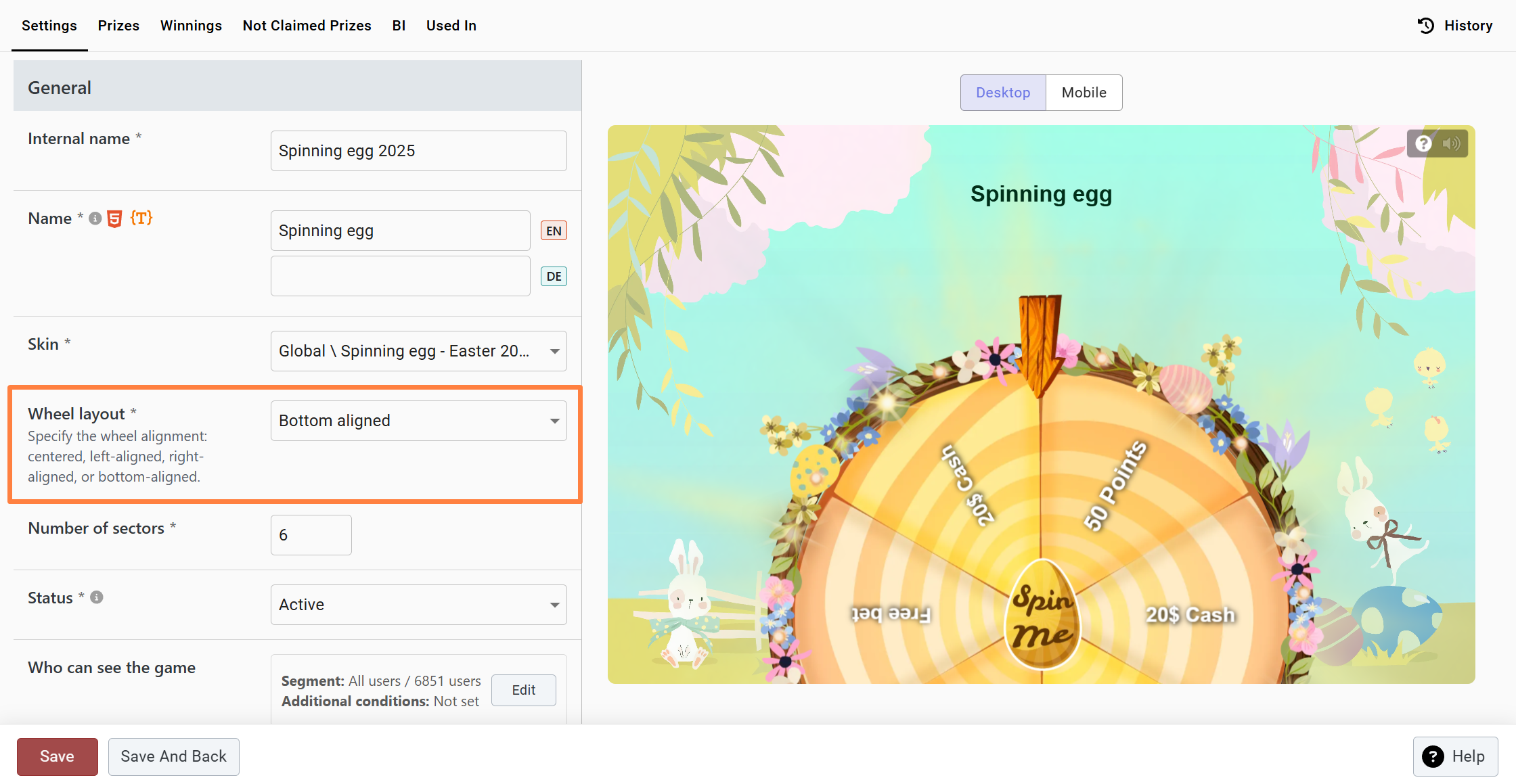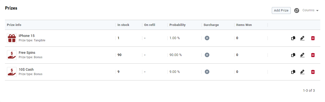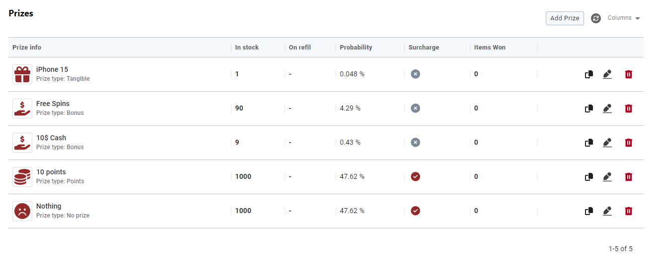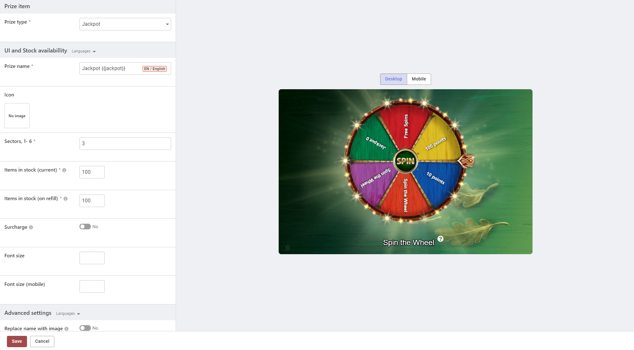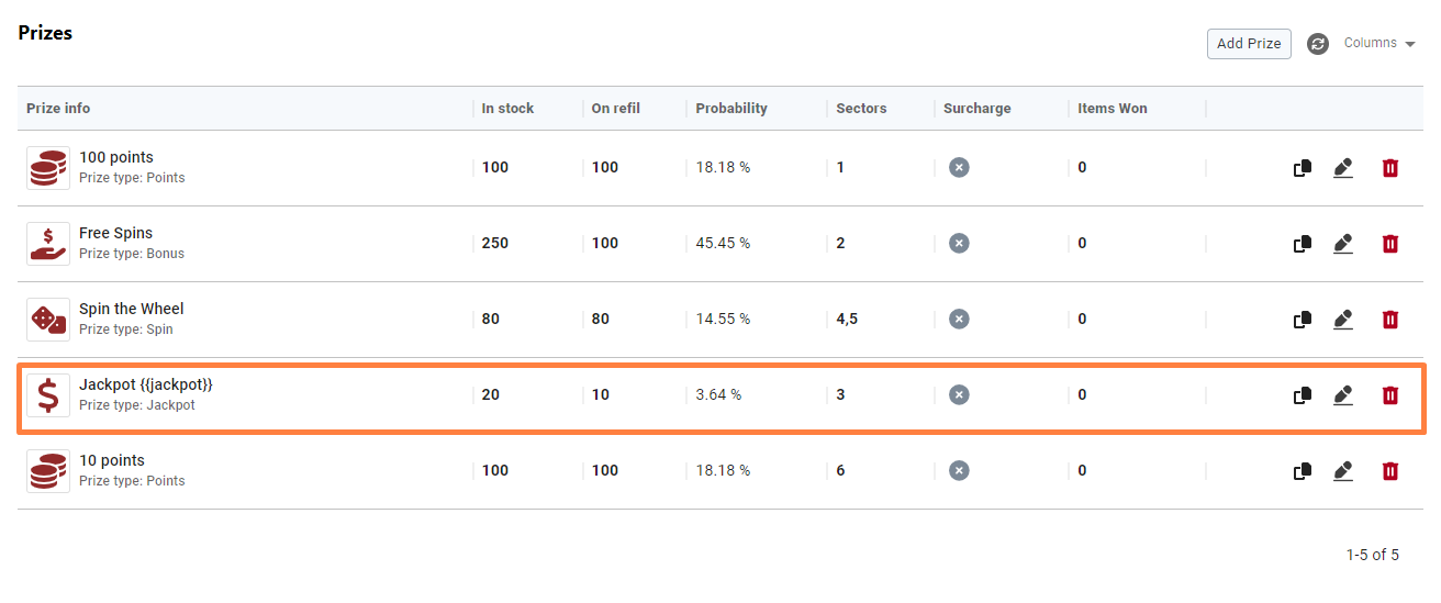 * Prize type - Points, No Prize, Bonus template, Tangible, Spin attempt (in the same or another game), Jackpot